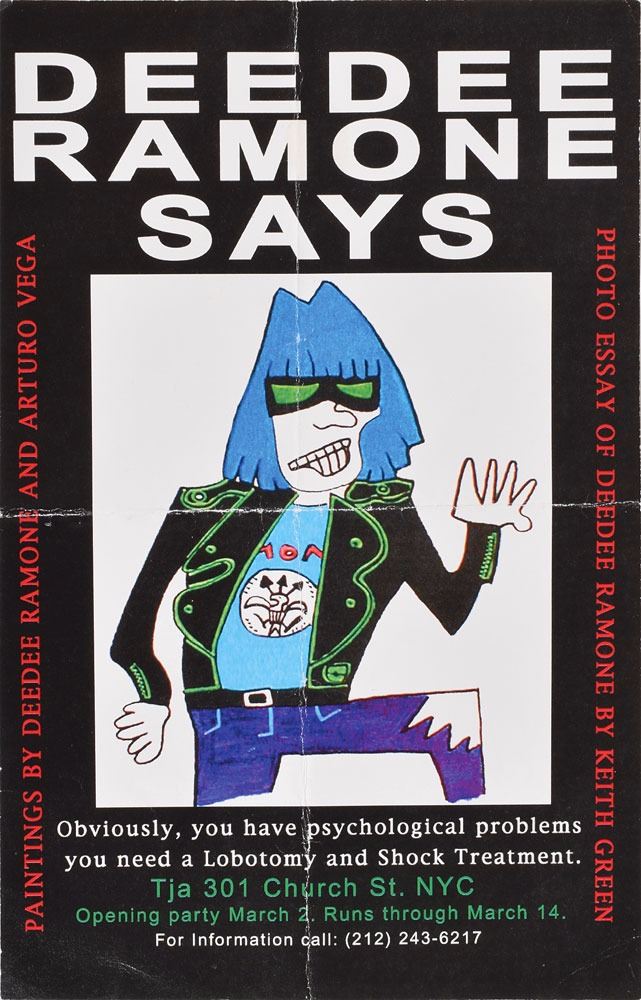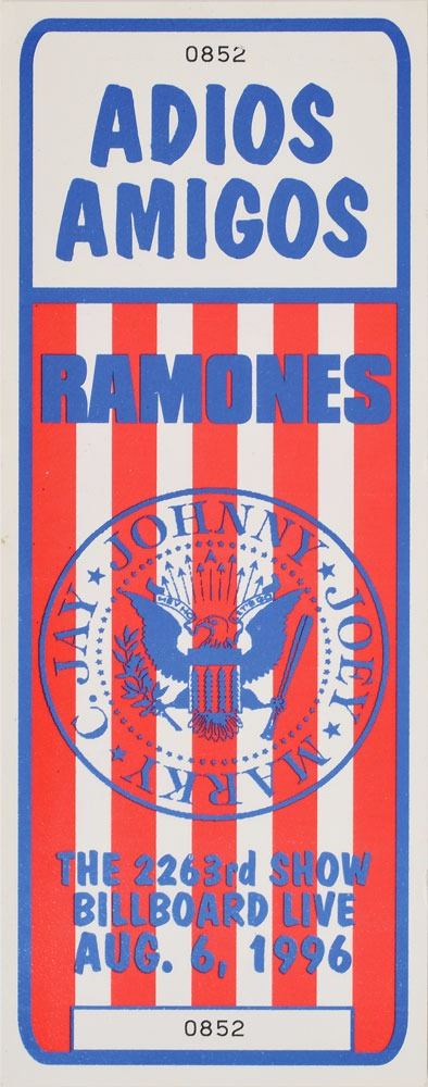 Group of four Ramones items, including: a ticket for their last-ever show on August 6, 1996, during the Adios Amigos tour; a 2002 announcement flyer for an exhibition of artwork by Dee Dee Ramone and Arturo Vega; a Soho Weekly News cover reading, "Matisse and the Ramones, We Have It All"; and a promotional album flat for Dee Dee Ramone's album Standing in the Spotlight, released under the name Dee Dee King. In overall very good to fine condition, with repaired tears and paper loss to the Soho Weekly News cover. These were displayed as part of the “Hey! Ho! Let’s Go: Ramones and the Birth of Punk” exhibit at the Queens Museum in New York from April 10, 2016–July 31, 2016, and the Grammy Museum at L.A. Live from September 16, 2016–February 28, 2017, and all but the album flat are accompanied by the Grammy Museum’s inventory labels. From the Monte A. Melnick Ramones Collection.