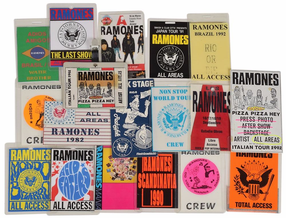 Collection of eighteen passes for various Ramones concerts, ranging in size from 2.5 x 4.25 to 3 x 5, and dated between 1982 and 1996. Passes include: an all areas "Pizza Pizza Hey" artist pass for the 1992 Italian tour; a pass for the 1990 Scandinavia tour; a crew pass with "Teenage Lobotomy" sticker; an all areas American flag access pass for a 1982 tour; a Non Stop World Tour crew pass; and an all areas pass for the 1991 Japan tour with presidential seal. In overall fine condition. These were displayed as part of the “Hey! Ho! Let’s Go: Ramones and the Birth of Punk” exhibit at the Queens Museum in New York from April 10, 2016–July 31, 2016, and the Grammy Museum at L.A. Live from September 16, 2016–February 28, 2017. From the Monte A. Melnick Ramones Collection.