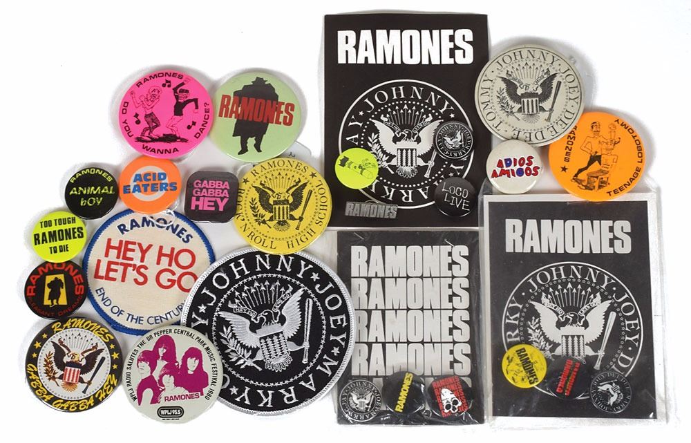 Cool collection of 23 Ramones pins, ranging in size from 1? to 2.5? in diameter, with a total of nine pins housed in their original packaging with Ramones backing. Pin designs include: a Teenage Lobotomy pin; a set of six Presidential seal pins; a Do You Wanna Dance? pin; a Gabba Gabba Hey pin; and pins for albums like Pleasant Dreams (2), Too Tough to Die, Acid Eaters, Animal Boy, and Adios Amigos. Also includes two embroidered patches: a 4? black with silver trim Presidential seal patch, and a 3? red, white, and blue End of the Century "Hey Ho Let's Go" patch. In overall fine condition. These were displayed as part of the “Hey! Ho! Let’s Go: Ramones and the Birth of Punk” exhibit at the Queens Museum in New York from April 10, 2016–July 31, 2016, and the Grammy Museum at L.A. Live from September 16, 2016–February 28, 2017, and are accompanied by the Grammy Museum’s inventory label. From the Monte A. Melnick Ramones Collection.