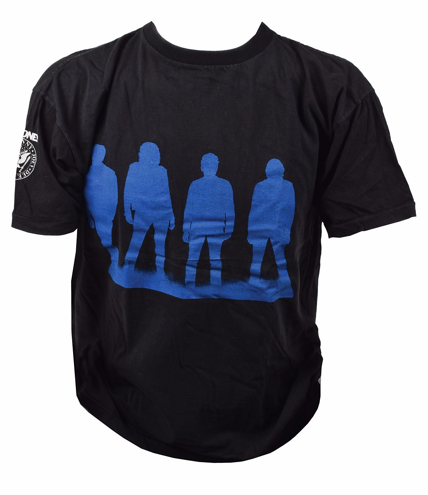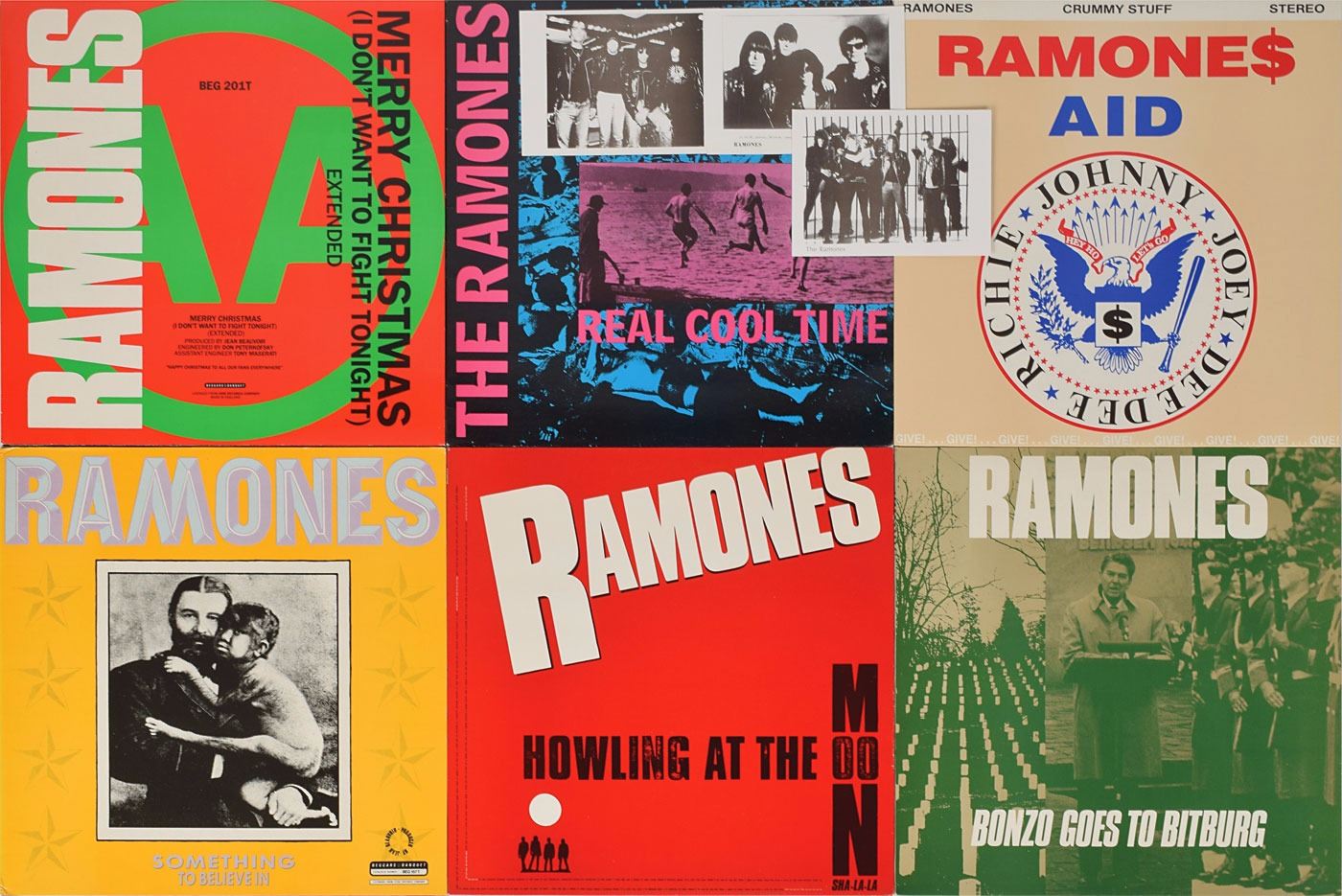 Uncommon limited edition End of the Decade album box set, numbered 1417/2500, consisting of six single records: 'Howling at the Moon / Smash You / Street Fighting Man'; 'Bonzo Goes to Bitburg / Go Home Ann / Daytime Dilemma'; 'Something to Believe In / Somebody Put Something In My Drink / Can't Say Anything Nice'; 'Crummy Stuff / Something to Believe In / (And I) Don't Wanna Live This Life'; 'Real Cool Time / Life Goes On / Indian Giver'; and 'I Wanna Live / Merry Christmas (I Don't Wanna Fight Tonight).' Also includes a large black End of the Decade t-shirt, a color 23.25 x 18.5 band poster, and three Ramones photo postcards. In very good to fine condition, with scuffing and wear to box.