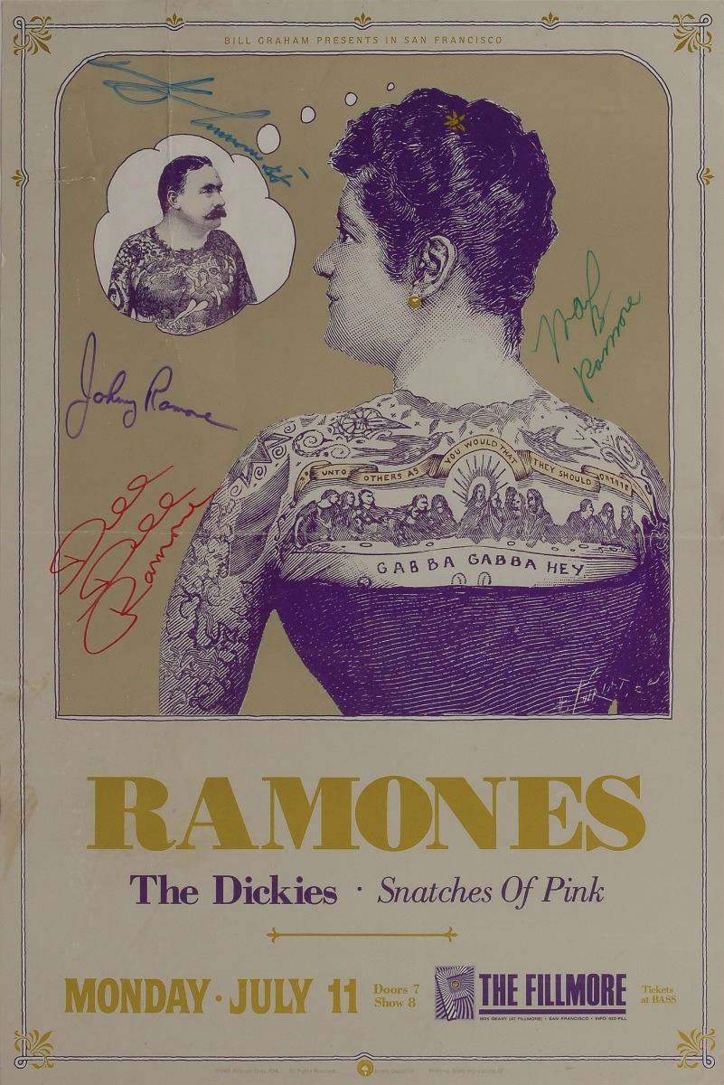 Attractive color Arlene Owseichik promotional poster for a Ramones concert held at The Fillmore in San Francisco on July 11, [1988], 12.75 x 19.25, signed in various colored felt tip by Johnny, Dee Dee, Marky, and Joey Ramone, who adds “88.” The poster features a tattooed woman daydreaming about a tattooed man, her back reading, “Gabba Gabba Hey,” with The Dickies and Snatches of Pink listed as supporting acts below.