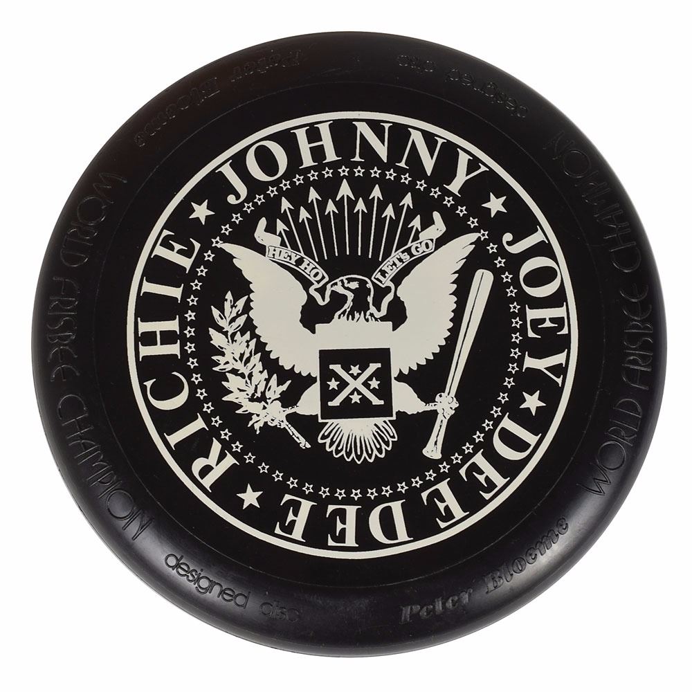 Black frisbee disc designed by world champion Peter Bloeme, measuring 9.25? in diameter, featuring a large white Ramones insignia on top. In fine condition. This was displayed as part of the “Hey! Ho! Let’s Go: Ramones and the Birth of Punk” exhibit at the Queens Museum in New York from April 10, 2016–July 31, 2016, and the Grammy Museum at L.A. Live from September 16, 2016–February 28, 2017. From the Monte A. Melnick Ramones Collection.