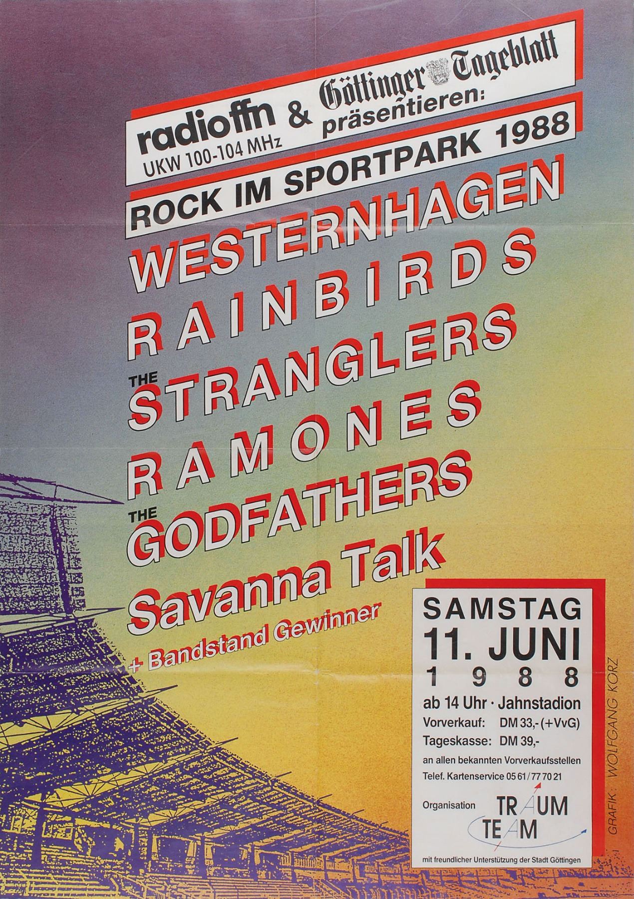 Original color German promotional poster for the Rock IM Sportpark Festival held at Regensburg, Germany's Jahnstadion on June 11, 1988, 23.25 x 32.75, listing Westernhagen, Rainbirds, The Stranglers, Ramones, The Godfathers, and Savanna Talk as the main performing acts. In fine, folded, and never-before-displayed condition. Accompanied by a letter of provenance from Chris Lamy, close friend of The Ramones and guitarist of The Jabbers, formerly GG Allin & The Jabbers.