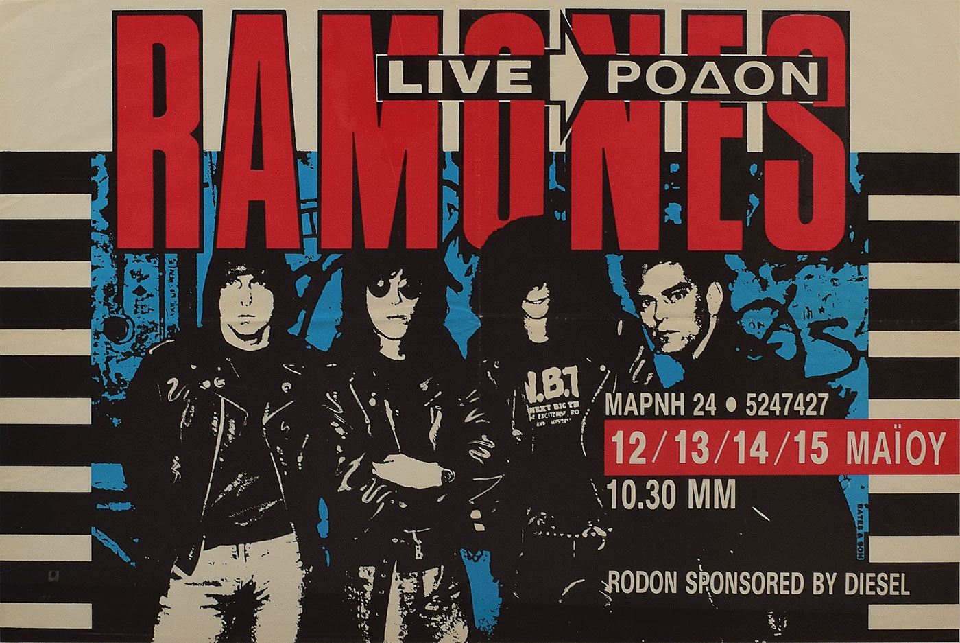 Appealing color 29.5 x 19.5 poster for a series of Ramones concerts at the Rodon Club in Athens, Greece, on May 12-15, 1989, which shows the band posing against a blue background with a bold red "Ramones" logo above. In fine, folded condition.