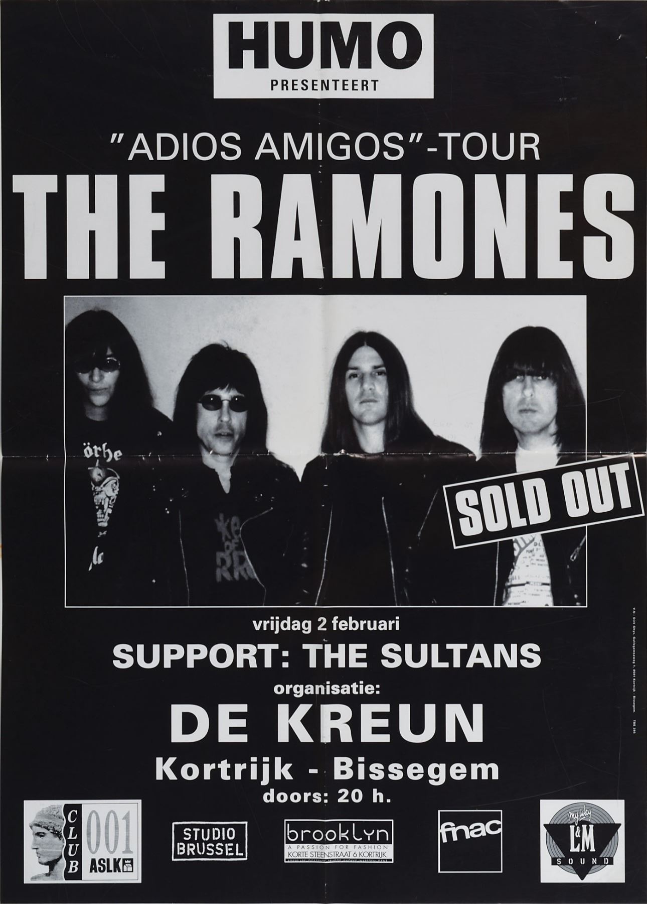 Original poster for a Ramones concert on February 2, 1996, held at the Ontmoetingscentrum in Kortrijk, Belgium, as part of the Adios Amigos Tour, 19.75 x 27.5, with a "Sold Out" box over an image of the band and the support act listed as The Sultans. In fine, folded condition, with expected wear.
