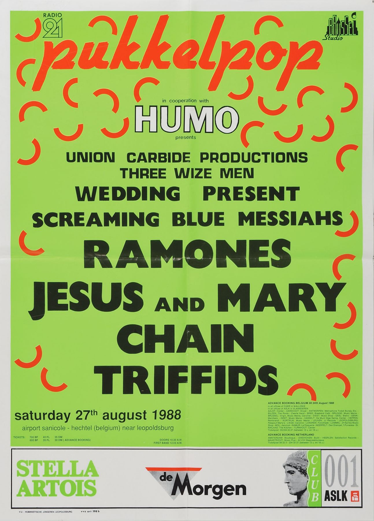 Vibrantly colored original poster for the Pukkelpop music festival on August 27, 1988, held at the Sanicole Airfield in Hechtel-Eksel, Belgium, 17 x 23.5, listing scheduled acts like the Ramones, Jesus and Mary Chain, Triffids, Screaming Blue Messiahs, Wedding Present, Three Wize Men, and Union Carbide Productions. In fine, folded condition, with expected wear.