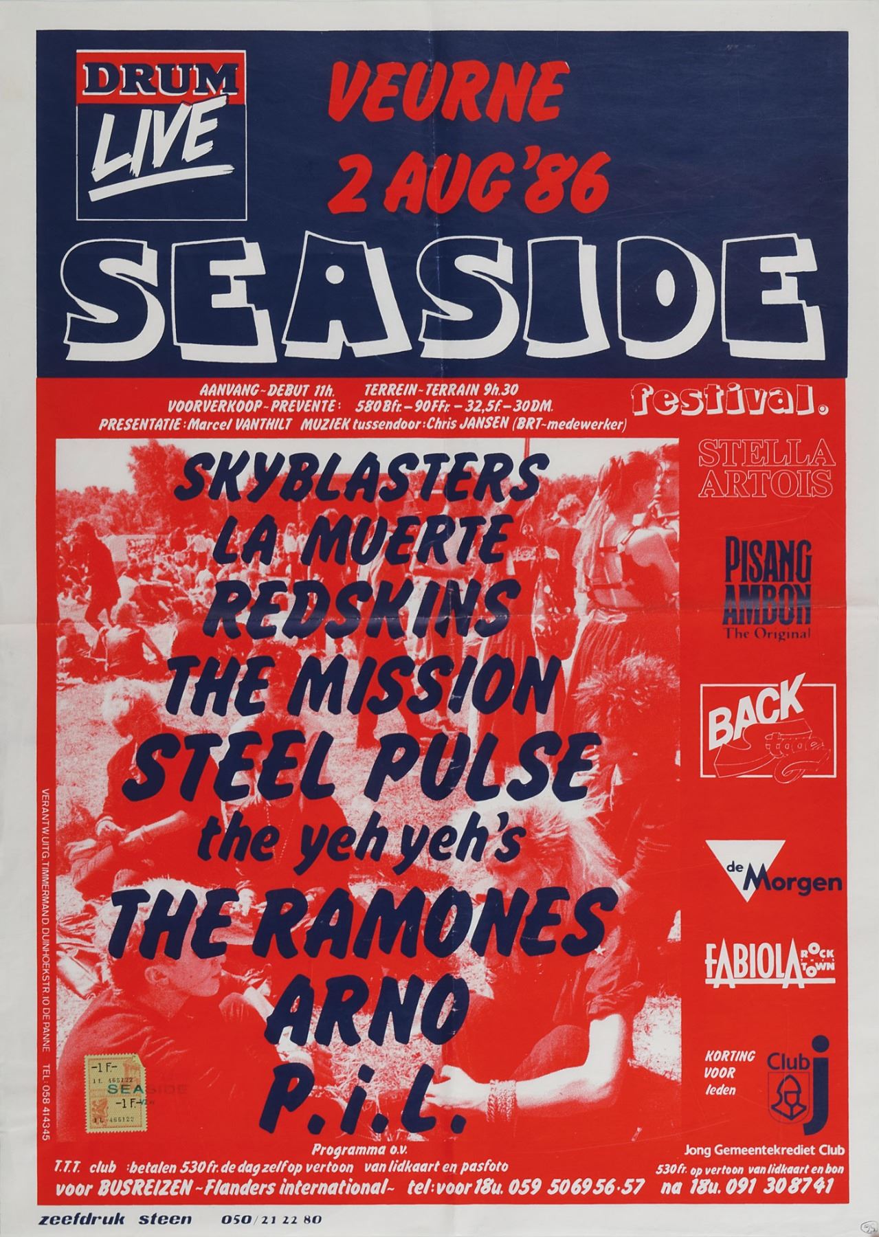 Color poster for the Seaside Festival on August 2, 1986, held in Veurne, Belgium, 17 x 24, showing an image of punk concertgoers with overlaid text listing the scheduled acts, including: The Ramones, Arno, P. i. L., The Yeh Yeh's, Steel Pulse, The Mission, Redskins, La Muerte, and Skyblasters. Lower left corner bears an affixed Seaside stamp. In fine, folded condition, with expected wear.
