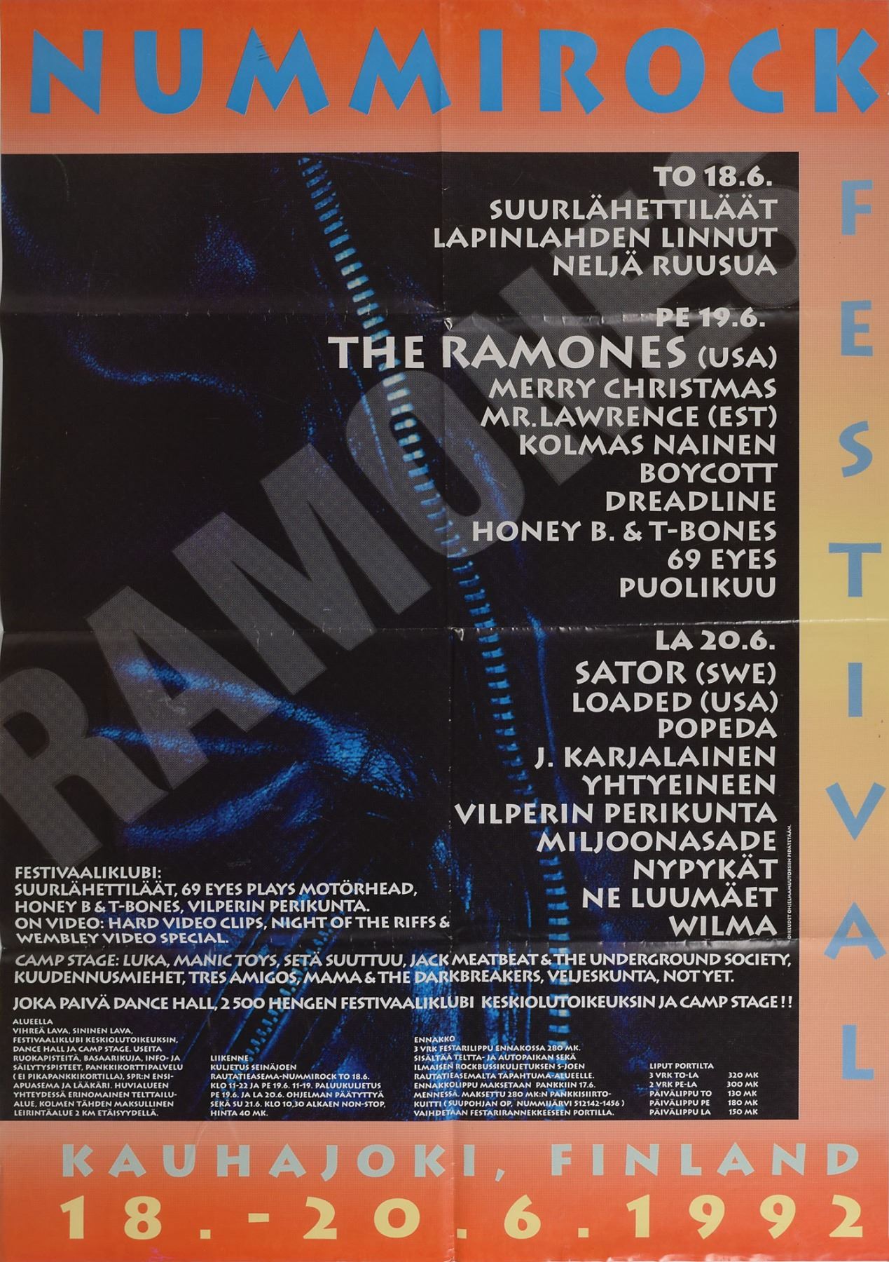 Large color 27.5 x 39 poster for the Nummirock Festival held in Nummijärvi, Kauhajoki, Finland, between June 18–20, 1992, with "Ramones" running diagonally in gray block letters and the right side listing the various bands scheduled to perform. In fine, folded condition, with expected wear.