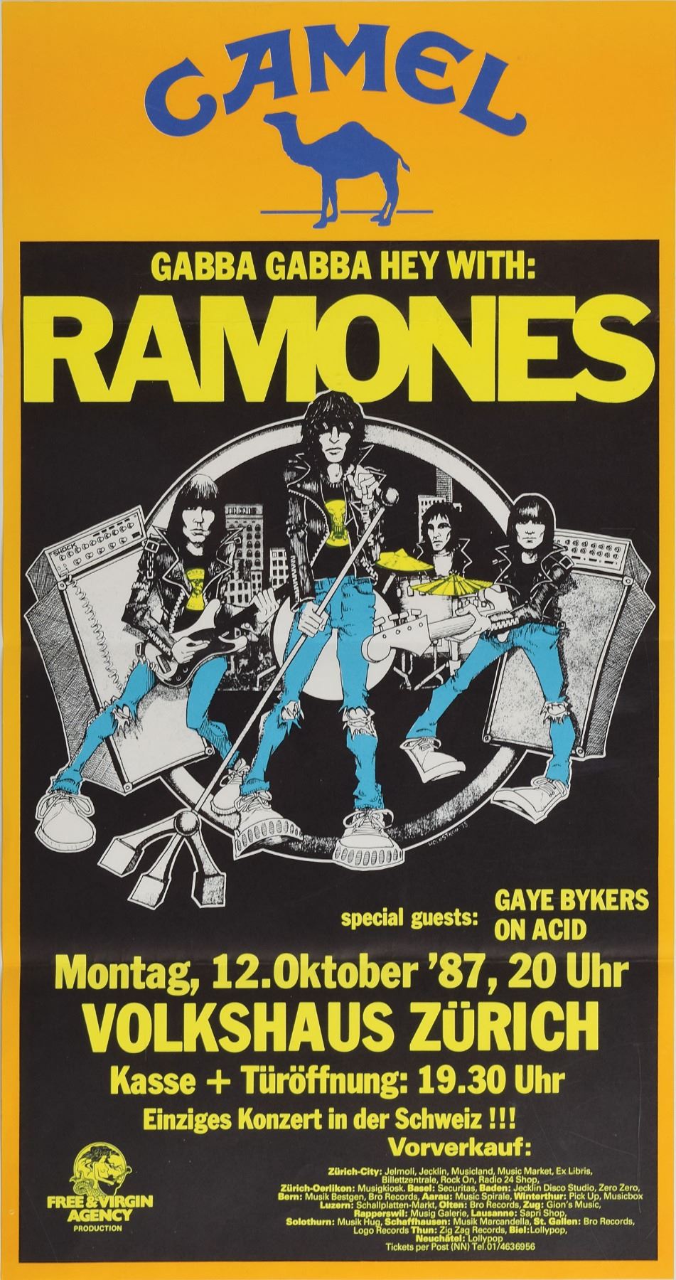 Colorful Camel promotional poster for a Ramones concert on October 12, 1987, held at the Volkhaus in Zurich, Switzerland, 12.5 x 24, featuring the cover for the band's 1978 album Road to Ruin, and reading "Gabba Gabba Hey with: Ramones" at the top, with Gaye Bykers on Acid listed as the supporting act. In fine, folded condition, with expected wear.