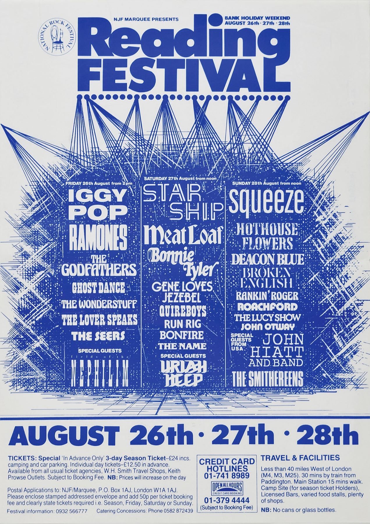 Blue-and-white poster for the Reading Festival held between August 26–28, 1988, at Little John's Farm in Reading, England, 11.75 x 16.5, listing the Ramones as performers on the opening day. In fine, folded condition, with expected wear.
