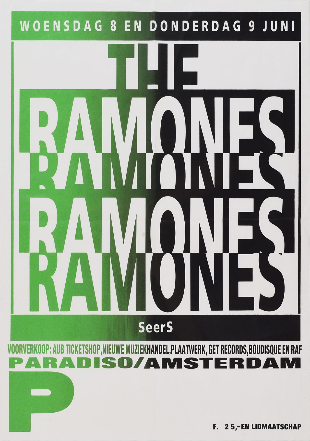 Color poster for a Ramones concert on June 9, 1988, held at Paradiso in Amsterdam, Netherlands, as part of the Halfway to Sanity Tour, 17 x 24, with the band name stacked four times and the supporting act listed as The Seers. In fine, folded condition, with expected wear.