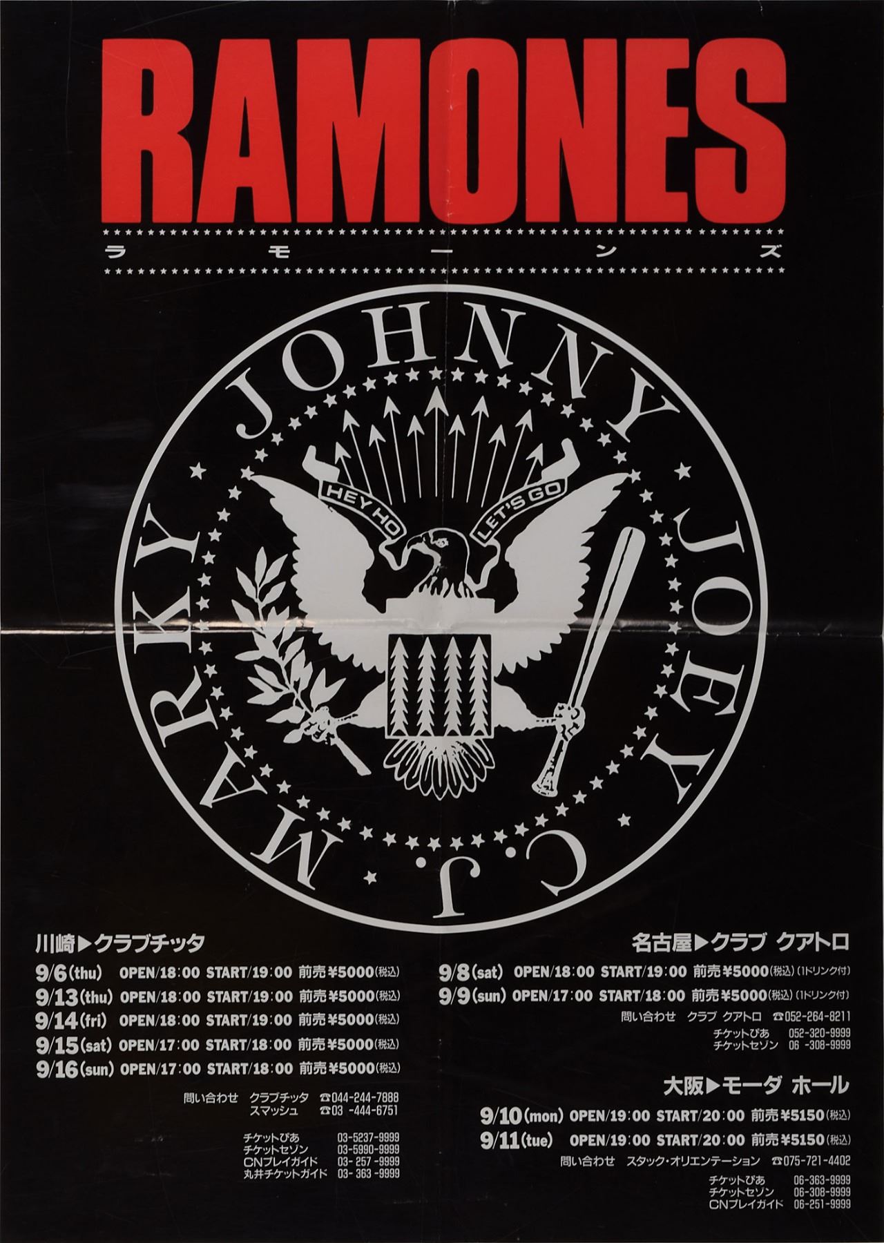 Color poster for a series of nine Ramones concerts throughout Japan between September 6–16, 1990, 16.5 x 23.5, showing the band's presidential seal and "Ramones" in large red block letters. In fine, folded condition, with expected wear.