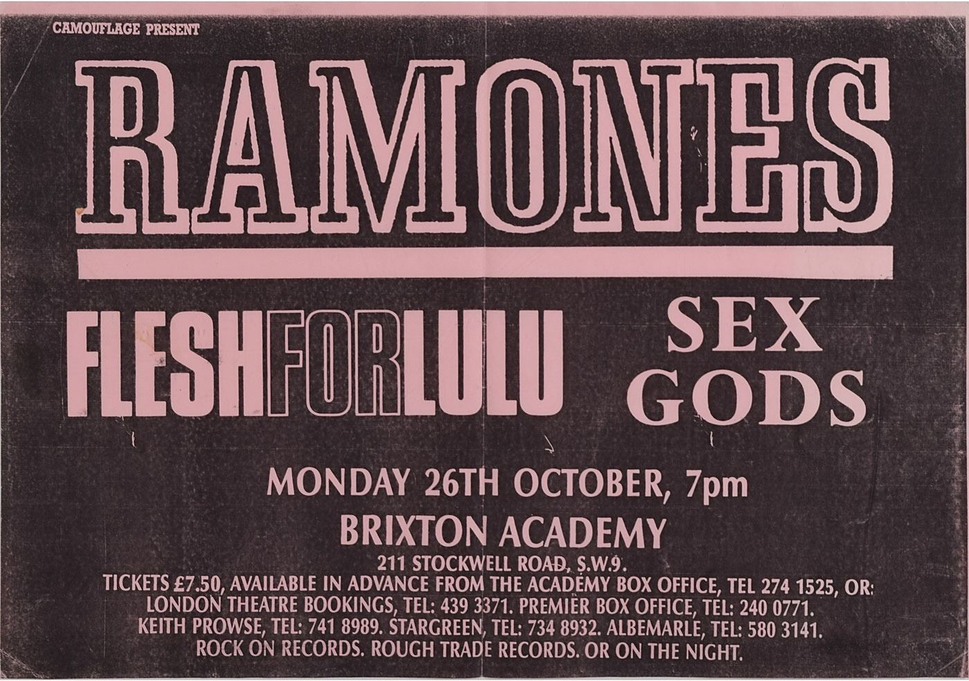 Original pink-and-black paperstock poster for a Ramones concert on October 26, 1987, held at London's Brixton Academy as part of the Halfway to Sanity Tour, 16.5 x 11.75, listing Flesh for Lulu and Sex Gods as the supporting acts. In fine, folded condition, with expected wear.
