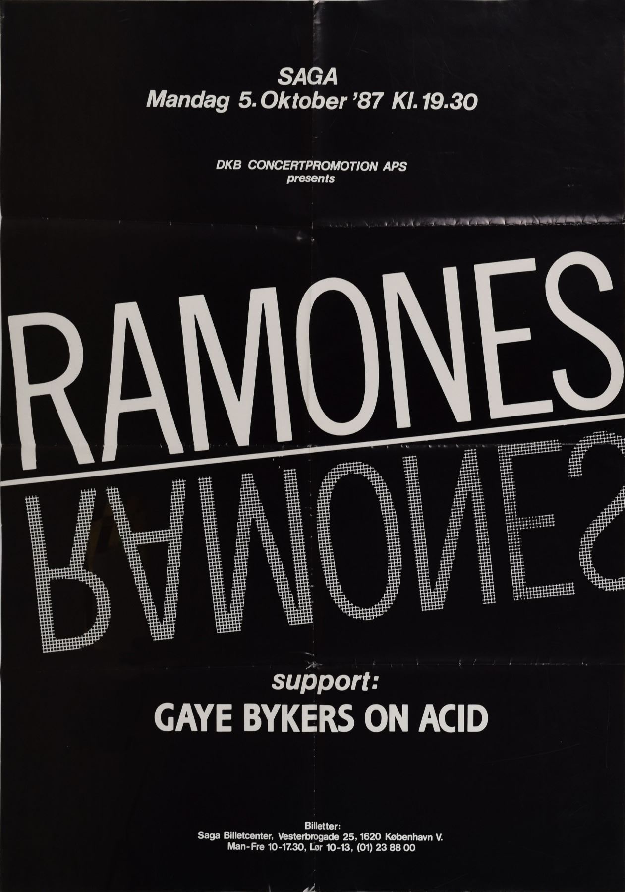 Uncommon original poster for a Ramones concert on October 5, 1987, at the Saga Rockteater in Copenhagen, Denmark, 23.75 x 33.25, with a large mirror image of the Ramones logo and listing the supporting act as Gaye Bikers on Acid. In fine, folded condition, with expected wear.