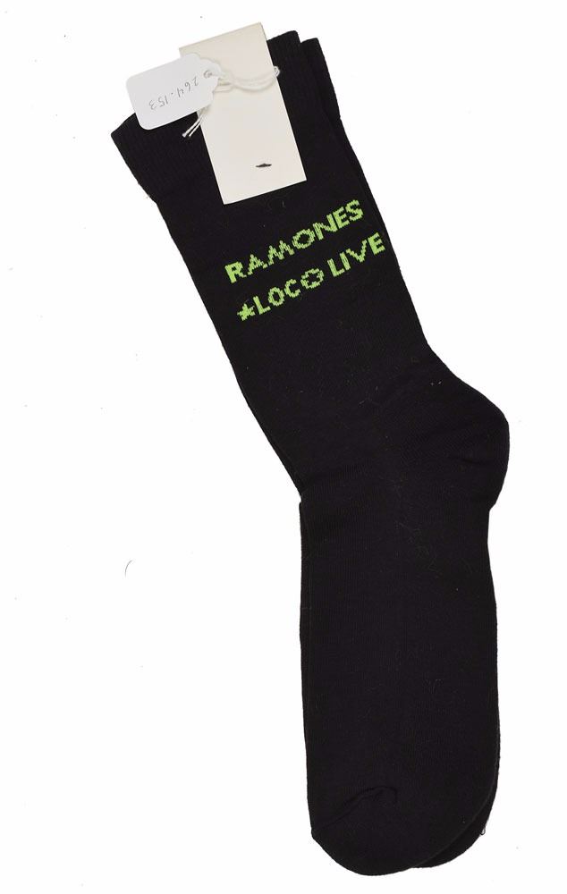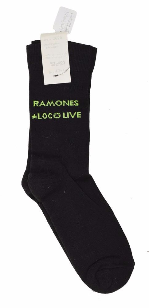 Pair of brand-new black socks, size 42–44, featuring green text, "Ramones, Loco Live," retaining their original cardboard tag at the top. In fine condition. This was displayed as part of the “Hey! Ho! Let’s Go: Ramones and the Birth of Punk” exhibit at the Queens Museum in New York from April 10, 2016–July 31, 2016, and the Grammy Museum at L.A. Live from September 16, 2016–February 28, 2017. From the Monte A. Melnick Ramones Collection.