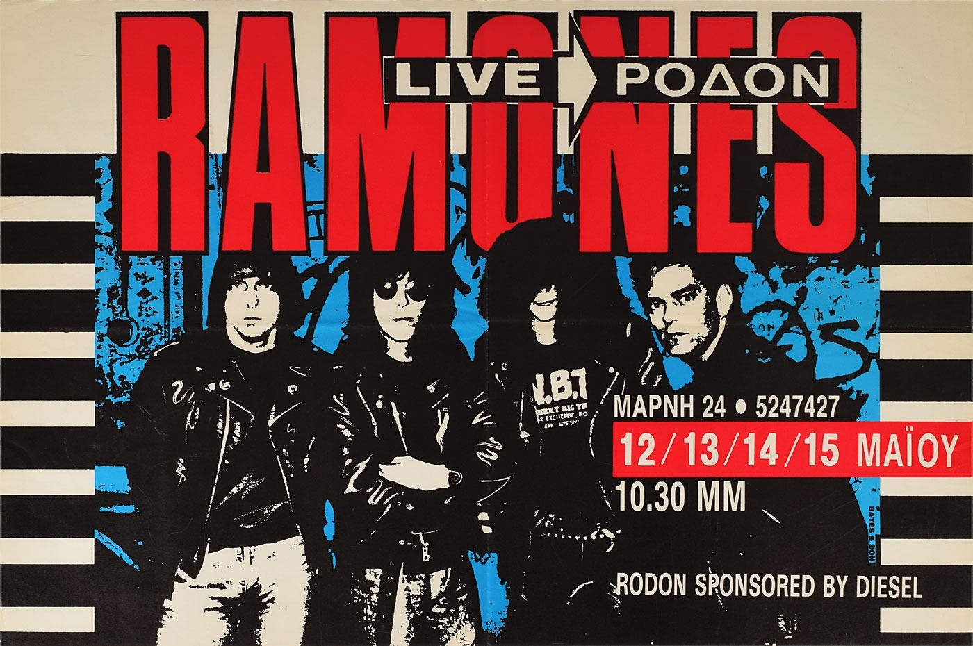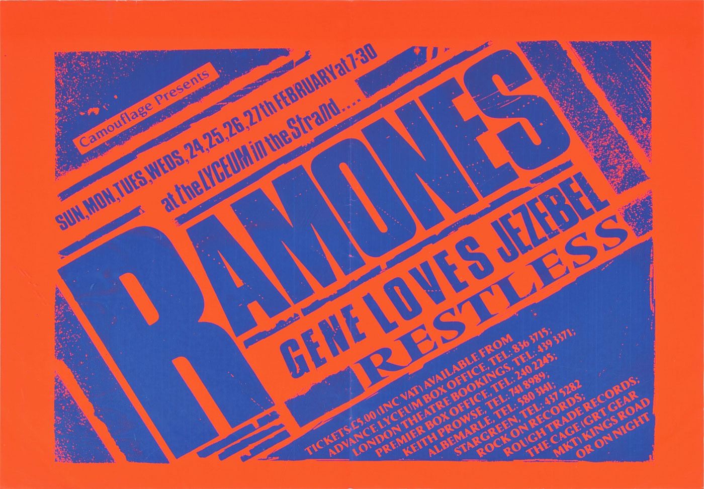 Two posters: a color 29.5 x 19.75 poster for a series of four Ramones concerts in Athens, Greece, on May 12–15, 1989; and a vibrant color 20 x 14.75 poster for a Ramones four-day concert event held at London’s Lyceum Theatre on February 24–27, [1985], listing Gene Loves Jezebel and Restless as the supporting acts. In overall fine, folded condition, with a tiny edge tear to the Greece poster.