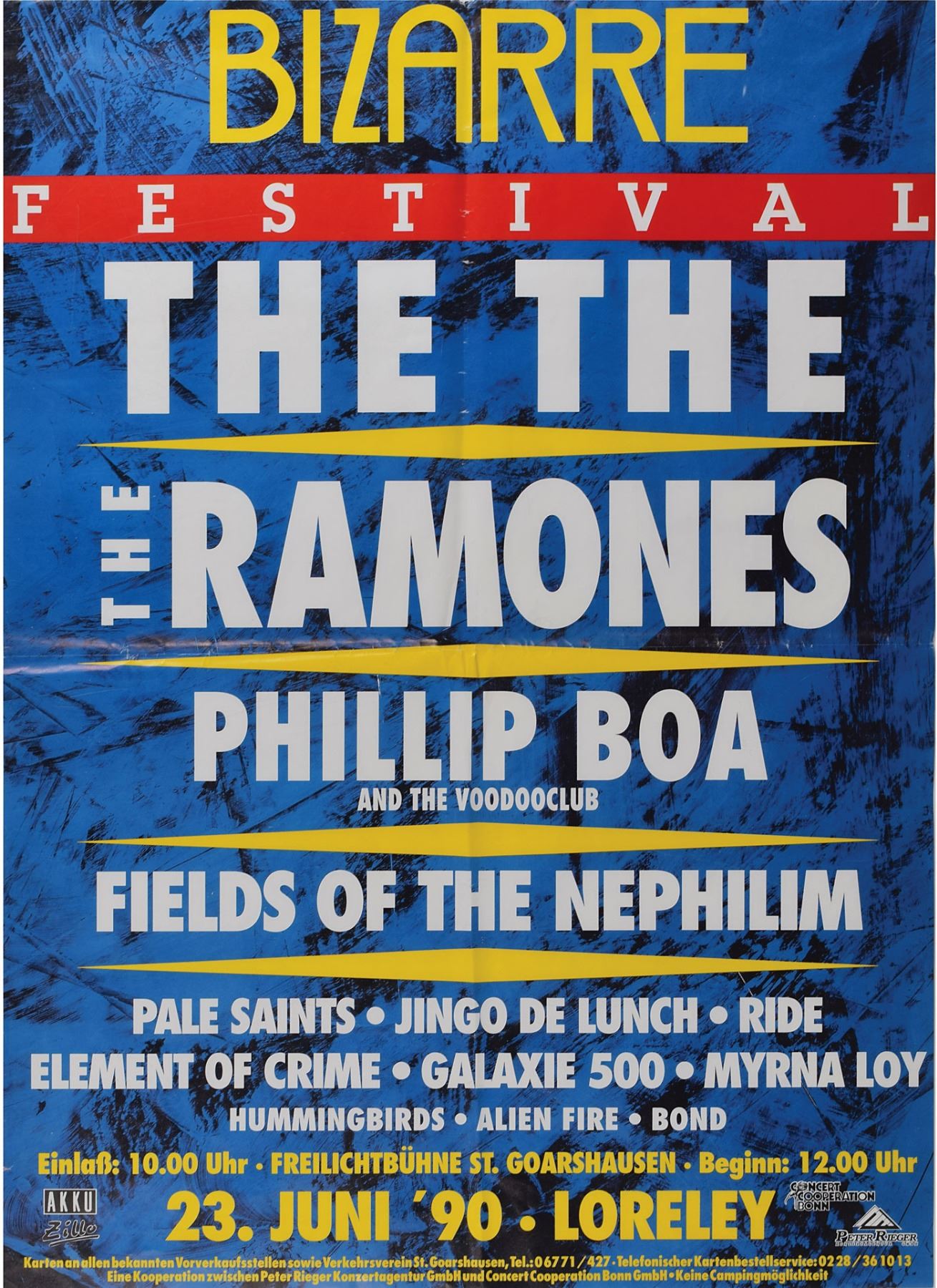 Color poster for the Bizarre Festival held on June 23, 1990, at Freilichtbuhne Loreley in St. Goarshausen, Germany, 23.25 x 33, listing The The, The Ramones, Phillip Boa and the Voodoo Club, and Fields of the Nephilim as the scheduled performers. In fine, folded condition, with expected wear.