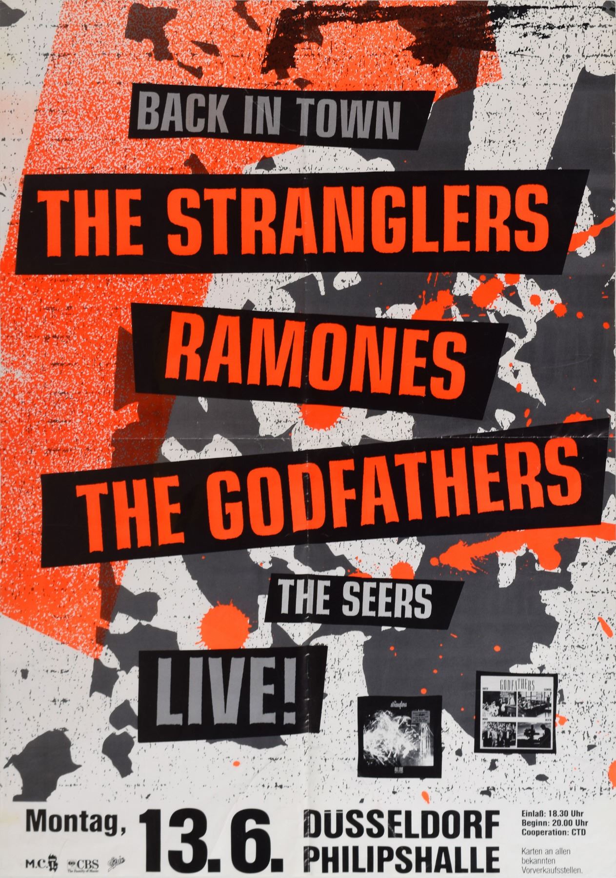 Neon-colored poster for the Back in Town festival held on June 13, 1988, at Philipshalle in Dusseldorf, Germany, 23.5 x 33, listing The Stranglers, Ramones, The Godfathers, and The Seers as the main performing acts. In fine, folded condition, with expected wear.