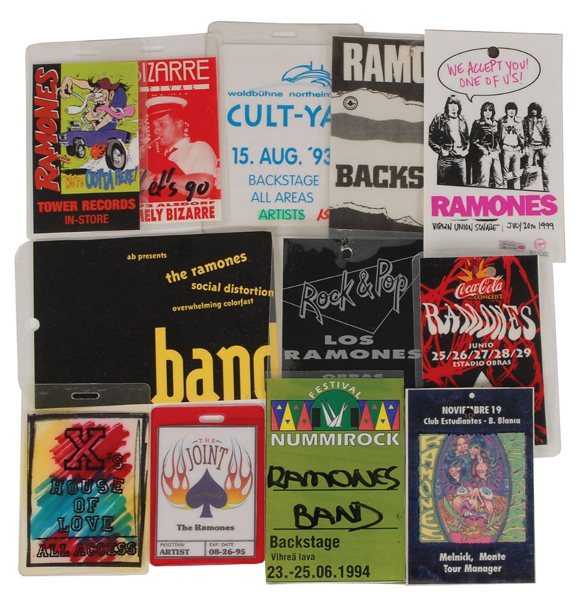 Set of twelve unsigned laminated passes for various Ramones concerts and events, ranging in size from 2.25 x 3.25 and 5.5 x 3.5, and dated between 1992 and 1999. Passes include: an Acid Eaters 1994 pass issued to tour manager Monte Melnick; a pass for the band’s in-store appearance at Tower Records promoting the their live album We’re Outta Here!; a pass for the 6th Bizarre Festival in Alsdorf, Germany, with a black felt tip notation, “Let’s go”; and a pass for the band’s reunion and album signing at the Virgin Union Square megastore. In overall fine condition.