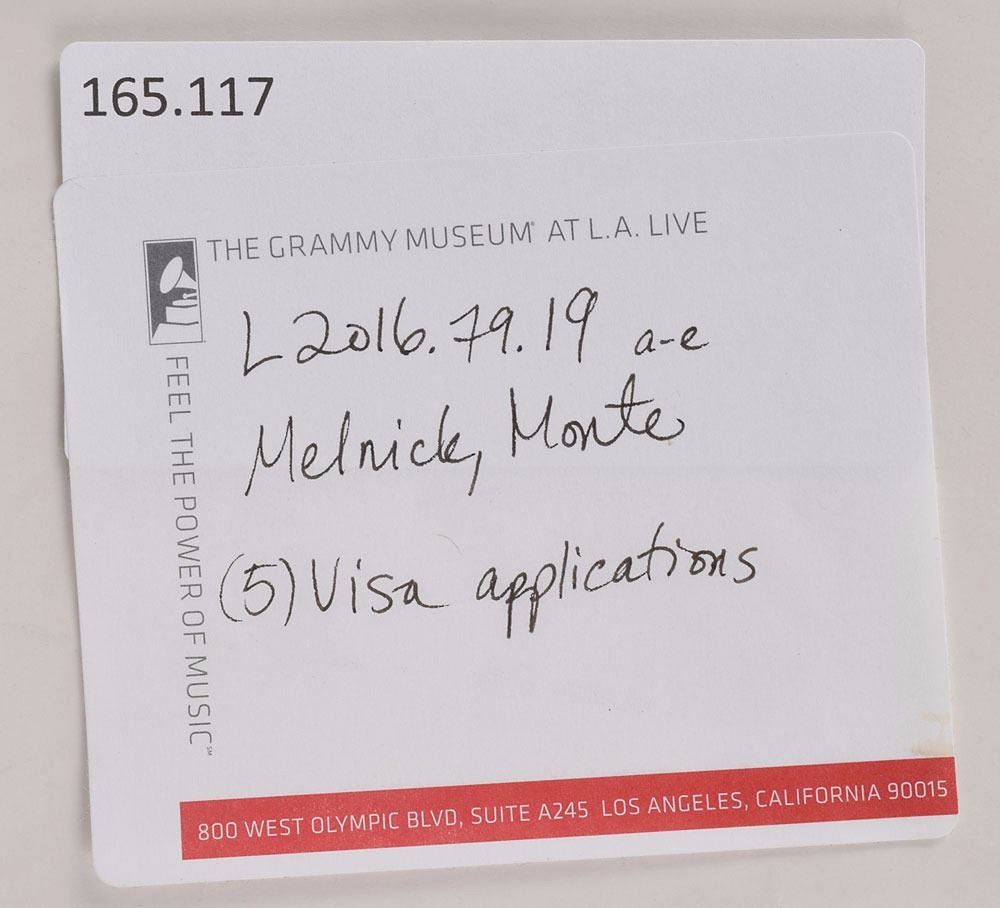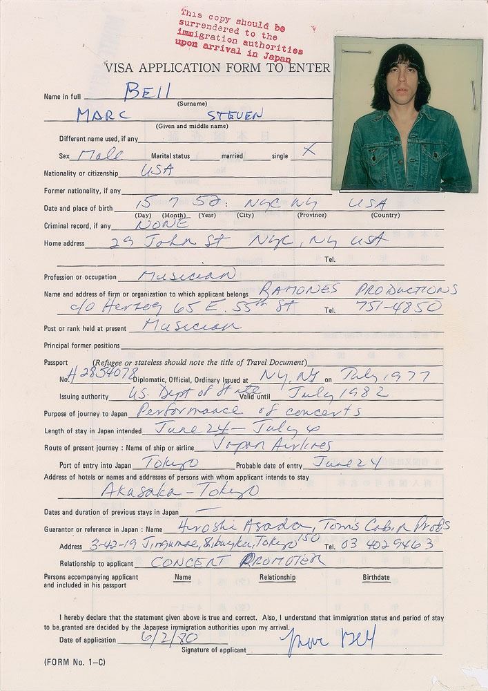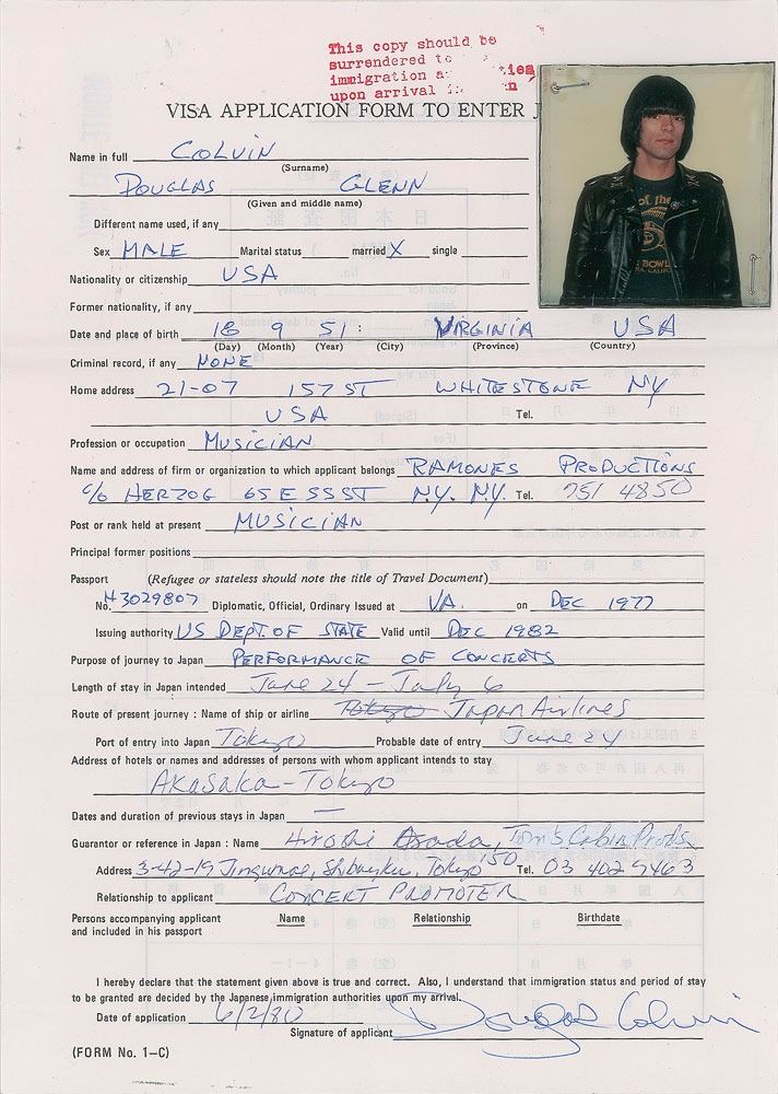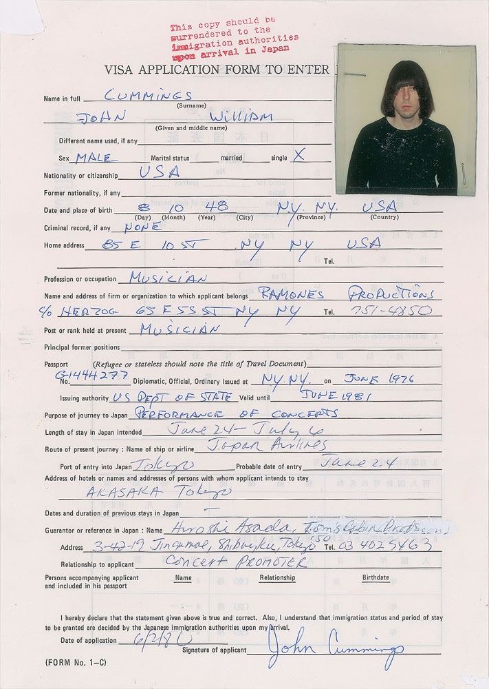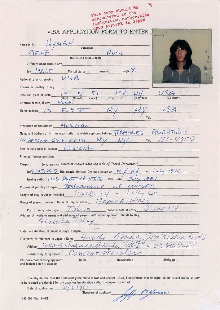 Remarkable set of visa applications for the Ramones' 1980 trip to Japan, each one page, 8.25 x 11.5, dated June 2, 1980, all signed using their given names. Applications include Joey Ramone ("Jeff Hyman"), Johnny Ramone ("John Cummings"), Marky Ramone ("Marc Bell"), and Dee Dee Ramone ("Douglas Colvin"), plus manager Monte Melnick. The applications are filled out in another hand, listing the purpose of their visit as "Performance of Concerts," and all bear color passport-style photos stapled to the upper right corner. In overall fine condition, with small areas of paper loss to corners of all but the Dee Dee Ramone document. These were displayed as part of the “Hey! Ho! Let’s Go: Ramones and the Birth of Punk” exhibit at the Queens Museum in New York from April 10, 2016–July 31, 2016, and the Grammy Museum at L.A. Live from September 16, 2016–February 28, 2017, and the lot is accompanied by the Grammy Museum’s inventory label. From the Monte A. Melnick Ramones Collection.