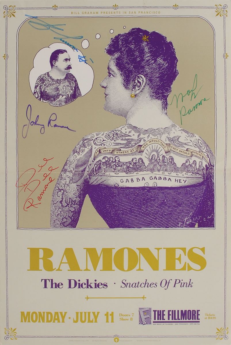 Uncommon color Arlene Owseichik promotional poster for a Ramones concert held at The Fillmore in San Francisco on June 11, [1988], 12.75 x 19.25, signed in various colored felt tip by Johnny, Dee Dee, Marky, and Joey Ramone, who adds “’88.” The poster features a tattooed woman daydreaming about a tattooed man, her back reading, “Gabba Gabba Hey,” with The Dickies and Snatches of Pink listed as supporting acts below. In fine condition, with a central horizontal fold.