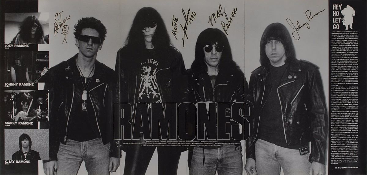 Stylish program for the Ramones’ 1990 tour of Japan, 10.25 x 14.25, signed in black felt tip on a three-page fold-out of the band by Johnny, Marky, CJ (adding a small stickman), and Joey Ramone (adding “1990”). Also signed by Monte Melnick, the band’s longtime tour manager. In fine condition, with light yellow haloing to the signatures.