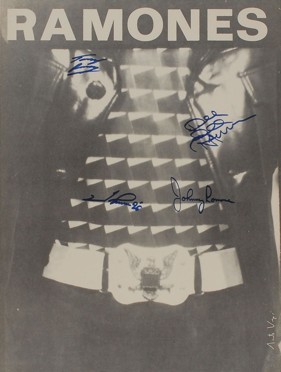 Uncommon early Ramones mini poster designed by the band’s art director Arturo Vega, 14.5 x 19.5, signed in blue felt tip by Johnny, Dee Dee, Tommy, and Joey Ramone, who adds “’96.” Rolled and in fine condition.
