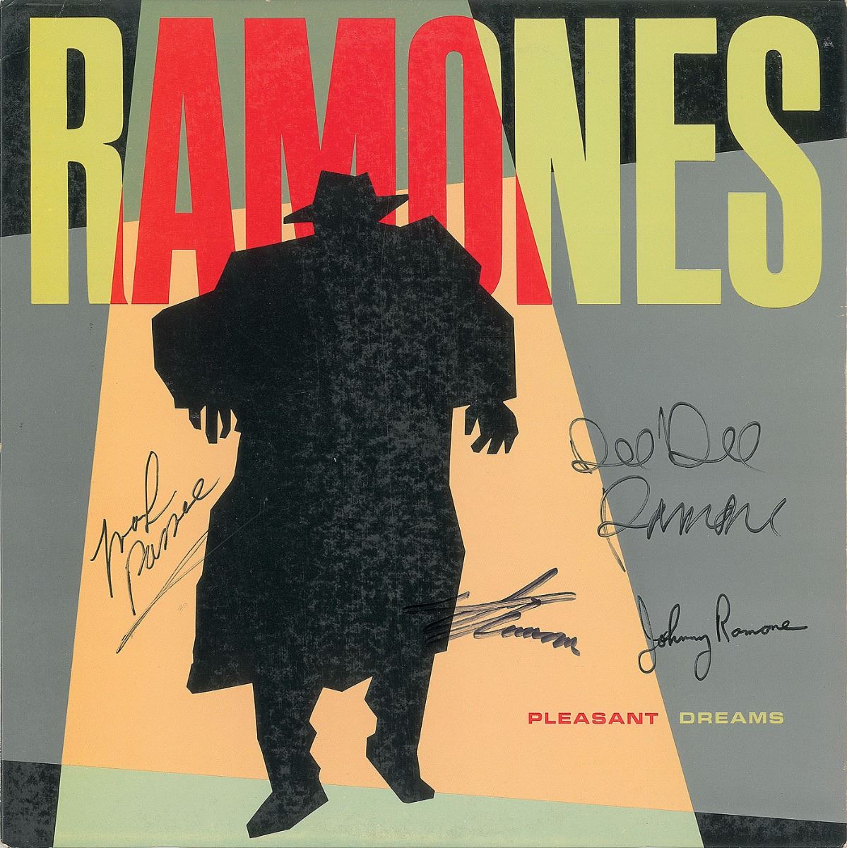 Pleasant Dreams album signed on the front cover in black felt tip by Joey, Johnny, Marky, and Dee Dee Ramone. In fine condition. The record is included. From the Punk Rock Collection of Adam Greiss.