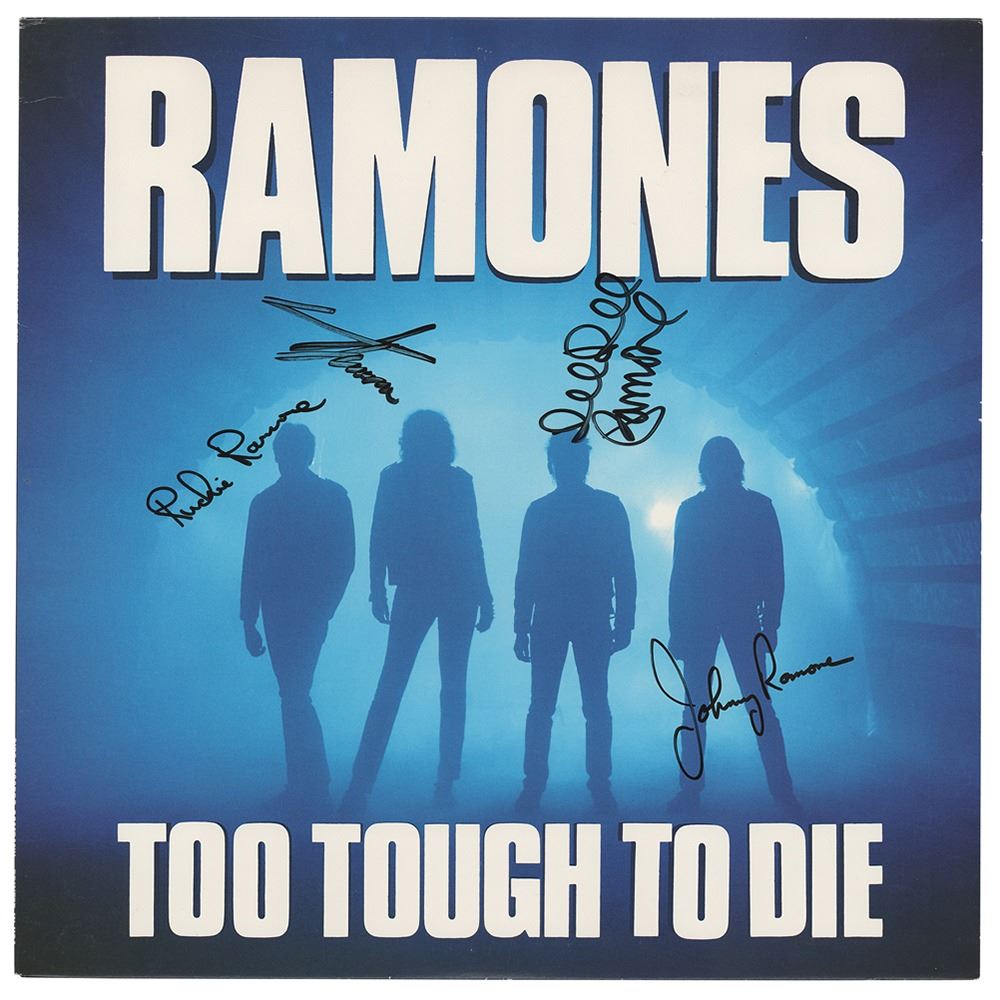 Too Tough to Die album by the Ramones, signed on the front cover in black felt tip by all four musicians who performed on the record—Joey, Johnny, Richie, and Dee Dee Ramone. In fine condition. The record is included.