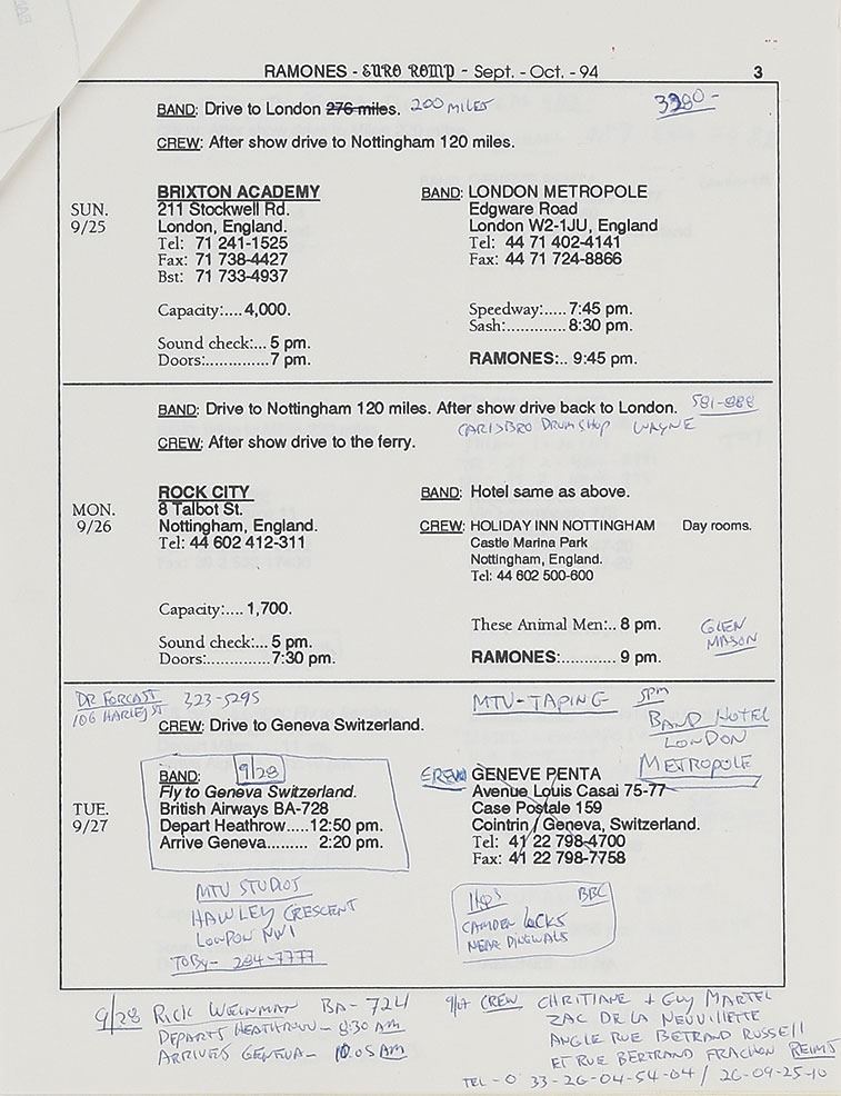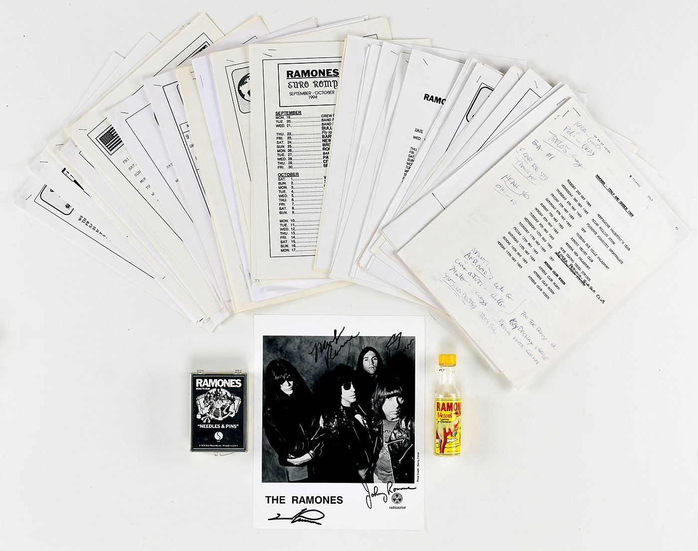 Unique grouping of items from the collection of Ramones tour manager Monte A. Melnick: a satin-finish 8 x 10 Radioactive Records publicity photo of the group, signed in black felt tip by Joey Ramone, Johnny Ramone, Marky Ramone, and CJ Ramone; an empty bottle of mezcal issued as a promo for ¡Adios Amigos!; a Sire Records 'Needles & Pins' box containing black and yellow tacks; and a collection of 24 itinerary packets for Ramones tours around the world between 1988 and 1995, including Mondo Bizarro, ¡Adios Amigos!, Acid Eaters, Ramones Mania, and others, many of which have been annotated by Melnick. Interestingly, at the bottom of the itinerary for their Italy and Greece tour in 1993, Melnick has written some translations: "Avanti Andiamo—Let's Go, Ciao-a-Tuti—Hello, Mato—Crazy." In overall fine condition.