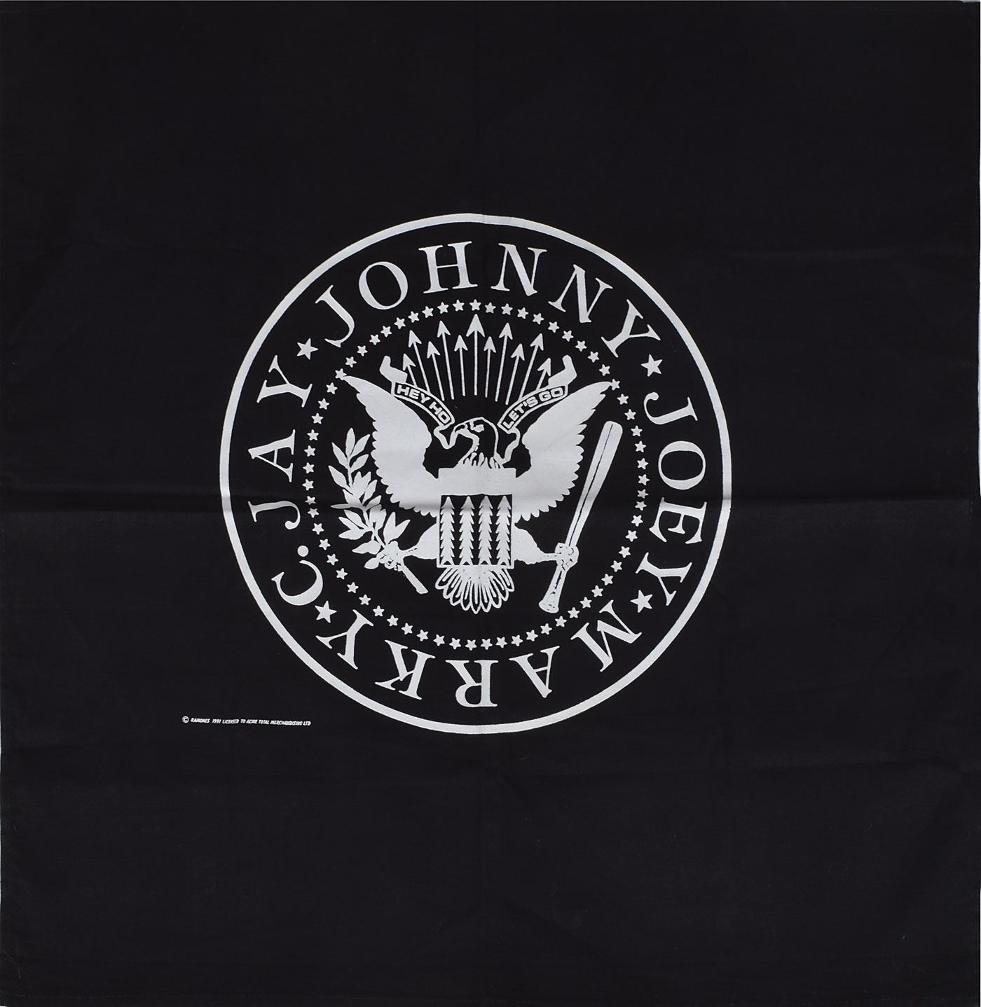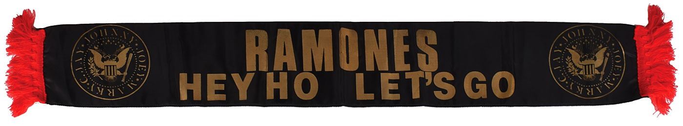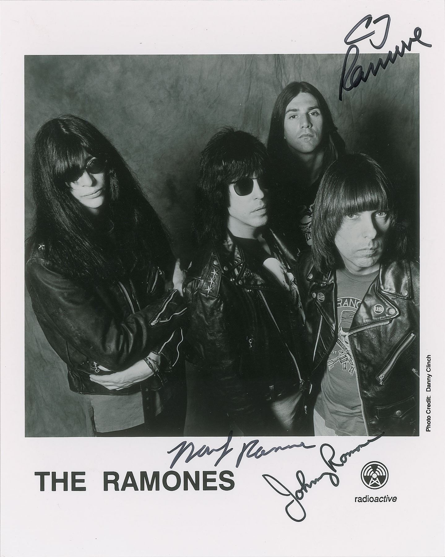 Group of three items from the collection of tour manager Monte A. Melnick: a satin-finish 8 x 10 Radioactive Records publicity photo of the Ramones, signed in black felt tip by CJ, Marky, and Johnny Ramone; a black polyester banner featuring gold text, "Ramones, Hey Ho Let's Go" with the band's presidential seal to either side, 46.5 x 6.5, with short red tassels at both ends; and a black-and-white fabric poster, 21.25 x 21.75, featuring the Ramones' iconic baseball bat-wielding presidential seal. In overall fine condition.