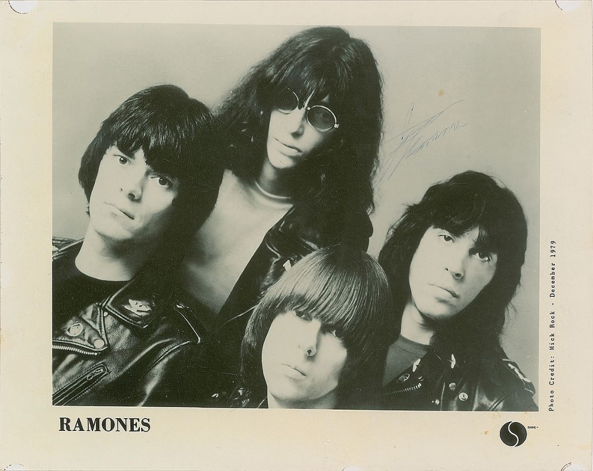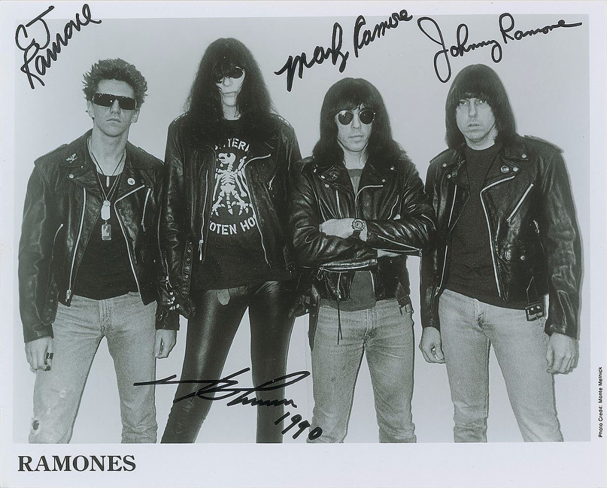 Glossy 10 x 8 publicity photo of the Ramones, signed in black felt tip by Johnny, Marky, CJ, and Joey Ramone, who adds “1990.” Also includes a glossy 10 x 8 Sire Records publicity photo of the Ramones, signed in black ballpoint by Joey Ramone. In overall fine condition, with crazing to the Joey signed photo. Accompanied by an unsigned glossy Premier publicity photo of the Ramones. From the Punk Rock Collection of Adam Greiss.