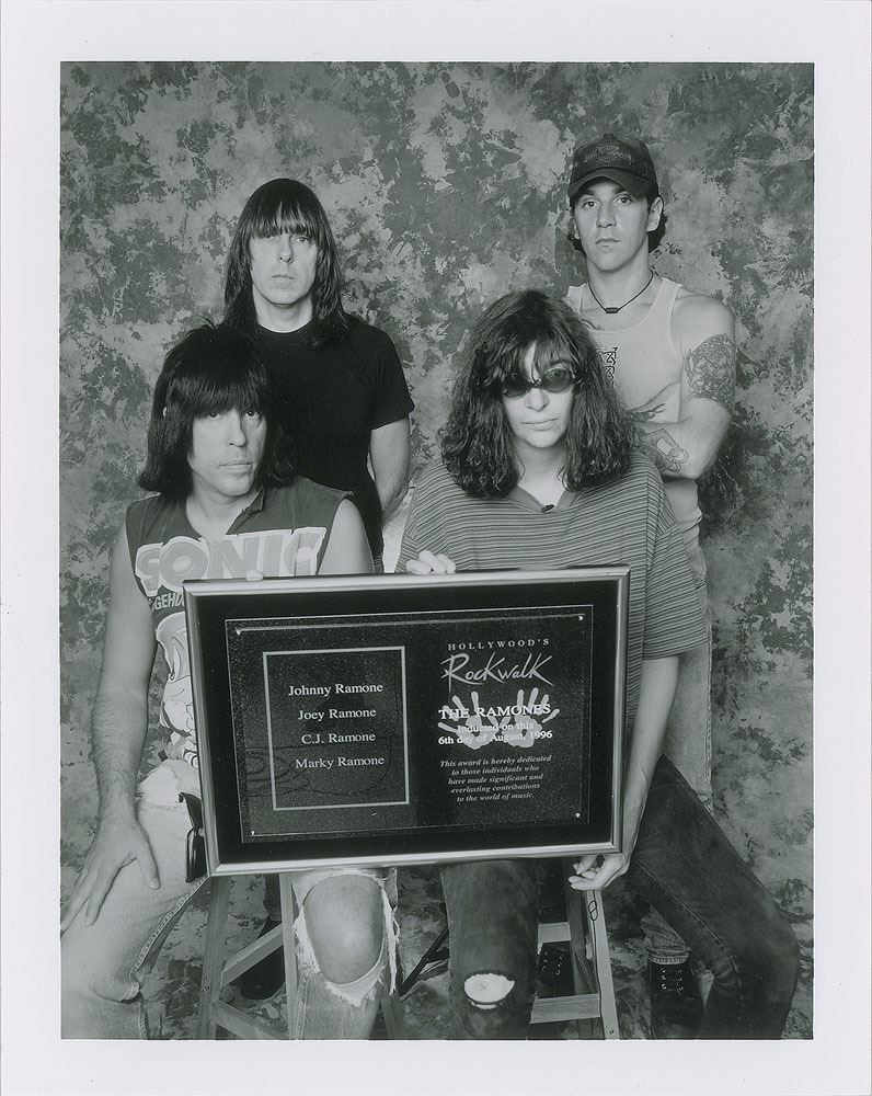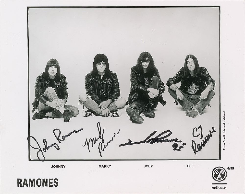 Ideal glossy 10 x 8 Radioactive Records publicity photo of the Ramones seated together, signed in black felt tip by Johnny, Marky, CJ, and Joey Ramone, who adds “95’.” In very fine condition. Accompanied by an unsigned photo of the band accepting a Hollywood Rockwalk plaque, and a letter of authenticity from the Joey Ramone Estate. Pre-certified REAL.