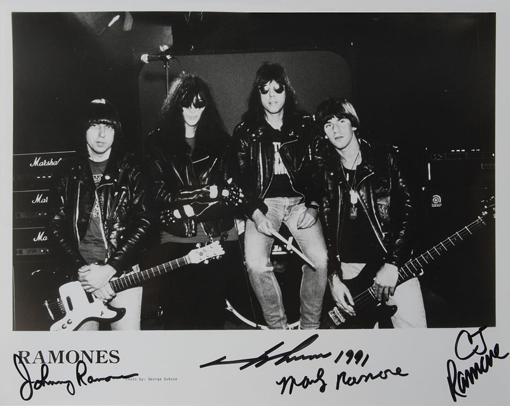Glossy 10 x 8 photo of the Ramones posing with their gear and instruments, signed in black felt tip by Johnny, Marky, CJ, and Joey Ramone, who adds "1991." In fine condition. From The Monte A. Melnick Ramones Collection. Pre-certified REAL.