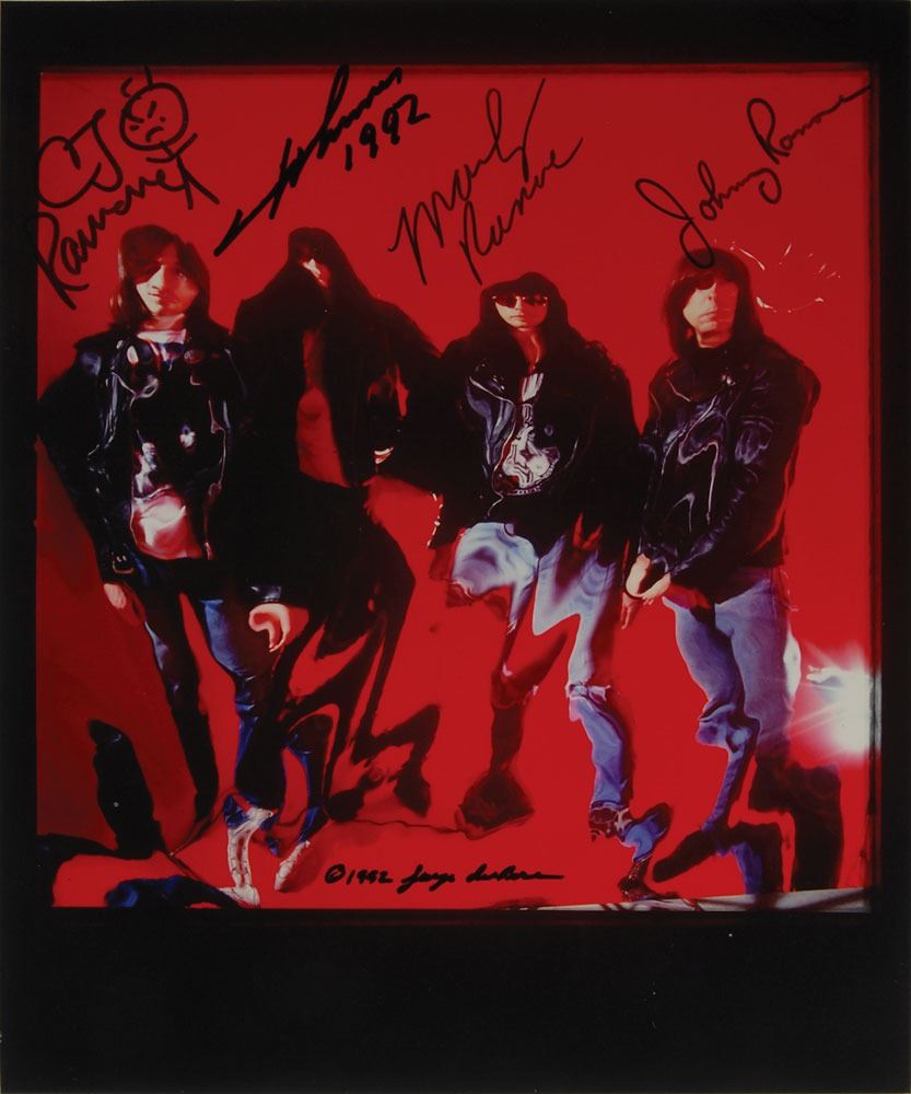 Uncommon color satin-finish 8.5 x 10.25 photo of the Ramones posing behind a distorted red screen, signed in black felt tip by Johnny, Marky, CJ (who adds a stick figure), and Joey Ramone (who adds "1992"). Also signed by the photographer, "1992, George DuBose." In fine condition, with trimming and scattered creasing. From The Monte A. Melnick Ramones Collection. Pre-certified REAL.