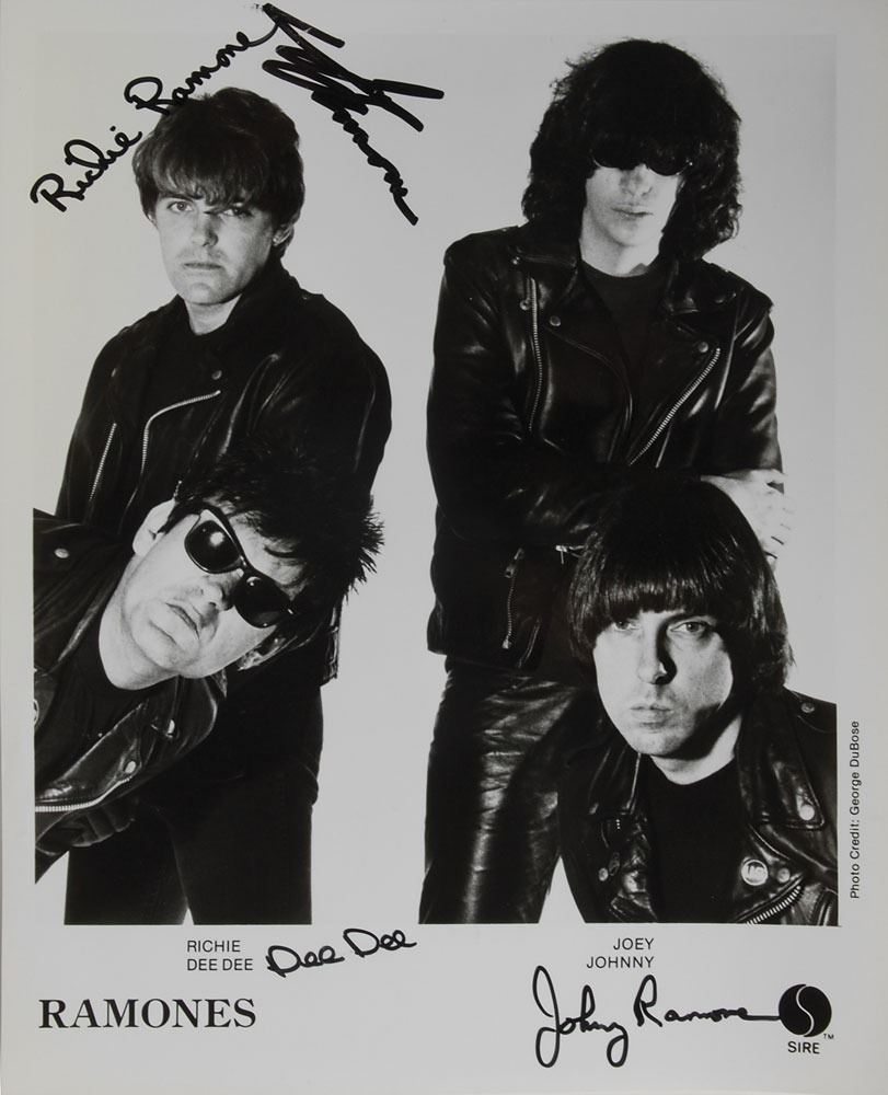 Glossy 8 x 10 Sire Records publicity photo of the Ramones in their trademark leather, signed in black felt tip by Joey, Johnny, Richie, and Dee Dee Ramone, the latter signing first name only. In fine condition, with light toning to upper left corner. The Monte A. Melnick Ramones Collection. Pre-certified REAL.