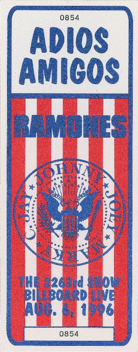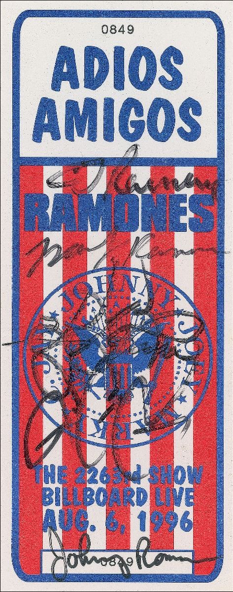 Patriotically colored ticket for the final Ramones concert held at the conclusion of their Adios Amigos tour, 2.75 x 6.75, presented by Billboard Live at The Palace in Los Angeles on August 6, 1996, signed in black felt tip by Johnny Ramone, Joey Ramone, C. J. Ramone, Marky Ramone, and De Dee Ramone. In fine condition. Accompanied by an unsigned example of the same ticket. The show was moved to The Palace because the Billboard Live venue was not ready, and these tickets had been printed prior to the change. Slated as the band’s final concert together, the “Last Show” featured numerous special guest appearances by rock and punk musicians like Lemmy from Motorhead, Eddie Vedder from Pearl Jam, Tim Armstrong and Lars Frederiksen of Rancid, and Chris Cornell and Ben Shepherd of Soundgarden. The concert was recorded and released the following year as a now out-of-print live album entitled We’re Outta Here!