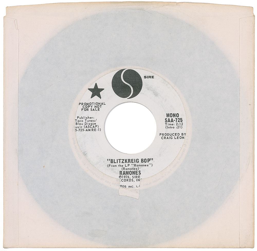 A set of three Sire Records promotional 45 RPM records of The Ramones' 1976 debut single for 'Blitzkrieg Bop' and 'Havana Affair' (two mono and one stereo). In overall fine condition. All are accompanied by their original paper sleeves, with the full-stereo version accompanied by its original 1976 ABC Records sleeve. Accompanied by a letter of provenance from Chris Lamy, close friend of The Ramones and guitarist of The Jabbers, formerly GG Allin & The Jabbers.