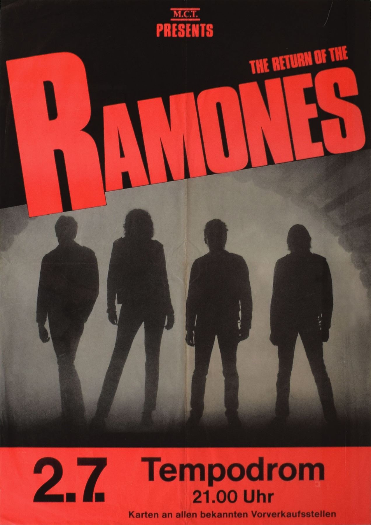 Stylish red-and-black 23.25 x 33 poster for a Ramones concert at Tempodrom in Berlin, Germany on July 2, 1985, which shows silhouettes of the band as they're pictured on the front cover of their eighth album, Too Tough to Die, with the upper border reading: "The Return of the Ramones." In fine, folded condition, with scattered creasing, heaviest where the folds meet.