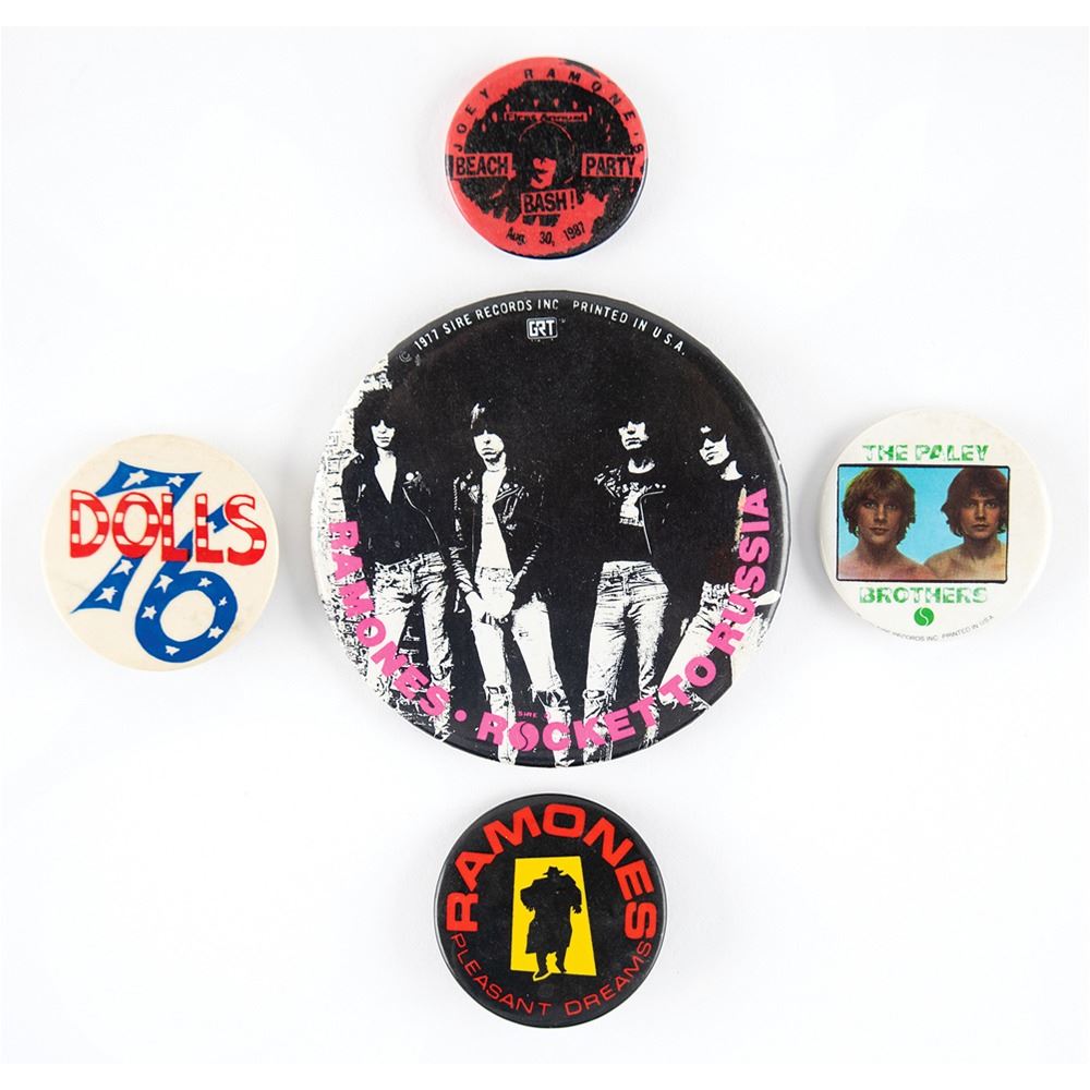 Lot of five early punk rock and power pop pins, ranging in size from 1.25Ë to 3Ë in diameter, which includes: a New Yorks Dolls “76†pin; a Paley Brothers pin; a pin for the Ramones album Pleasant Dreams; a pin for Joey Ramone’s first annual Beach Party Bash, held on August 30, 1987; and a pin for the Ramones album Rocket to Russia. In overall fine condition.