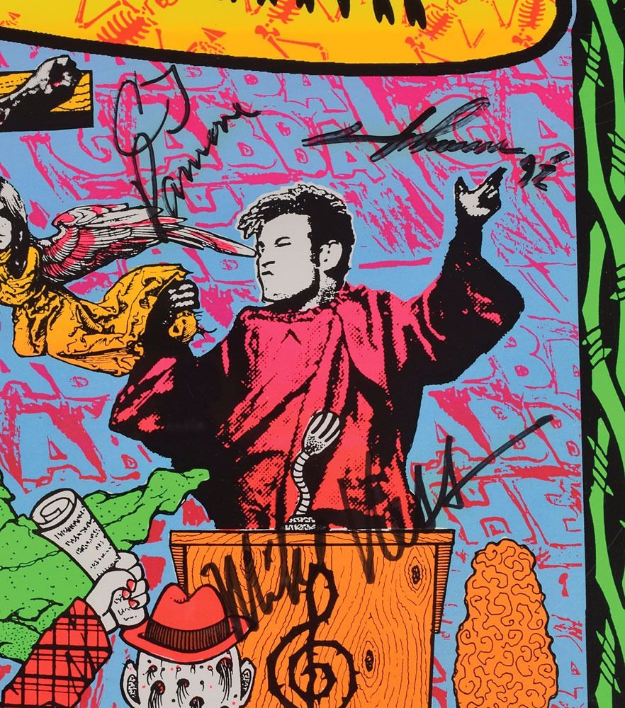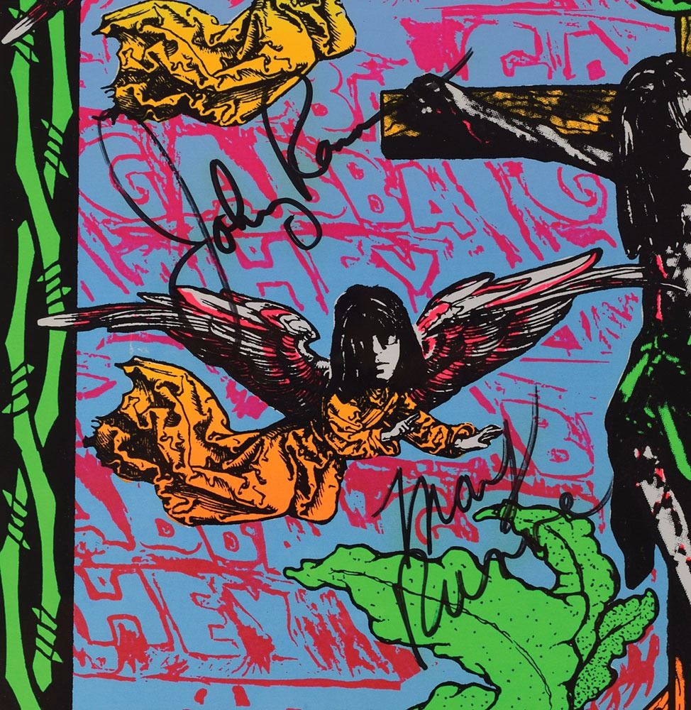 Vividly colored poster for a Ramones and Social Distortion concert on October 22, 1992, held at the Palmer Auditorium in Austin, Texas, 17.5 x 22.5, listing the supporting act as Overwhelming Colorfast, and signed in black felt tip by Johnny, CJ, Marky, and Joey Ramone, who adds "92," and by Mike Ness. In fine condition, with haloing and contrast to signatures. This was displayed as part of the “Hey! Ho! Let’s Go: Ramones and the Birth of Punk” exhibit at the Queens Museum in New York from April 10, 2016–July 31, 2016, and the Grammy Museum at L.A. Live from September 16, 2016–February 28, 2017. From the Monte A. Melnick Ramones Collection.