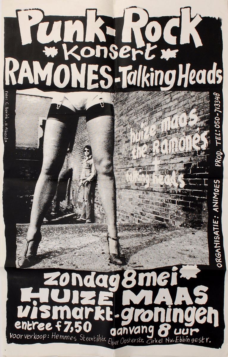 Appealing 27.5 x 43 poster for a Ramones and Talking Heads concert at Huize Maas Vismarkt in Groningen, Netherlands, on May 8, 1977, showing a woman in a leggy stance with an admirer leaning against a brick wall. In fine condition, with partial separations to expected storage folds.