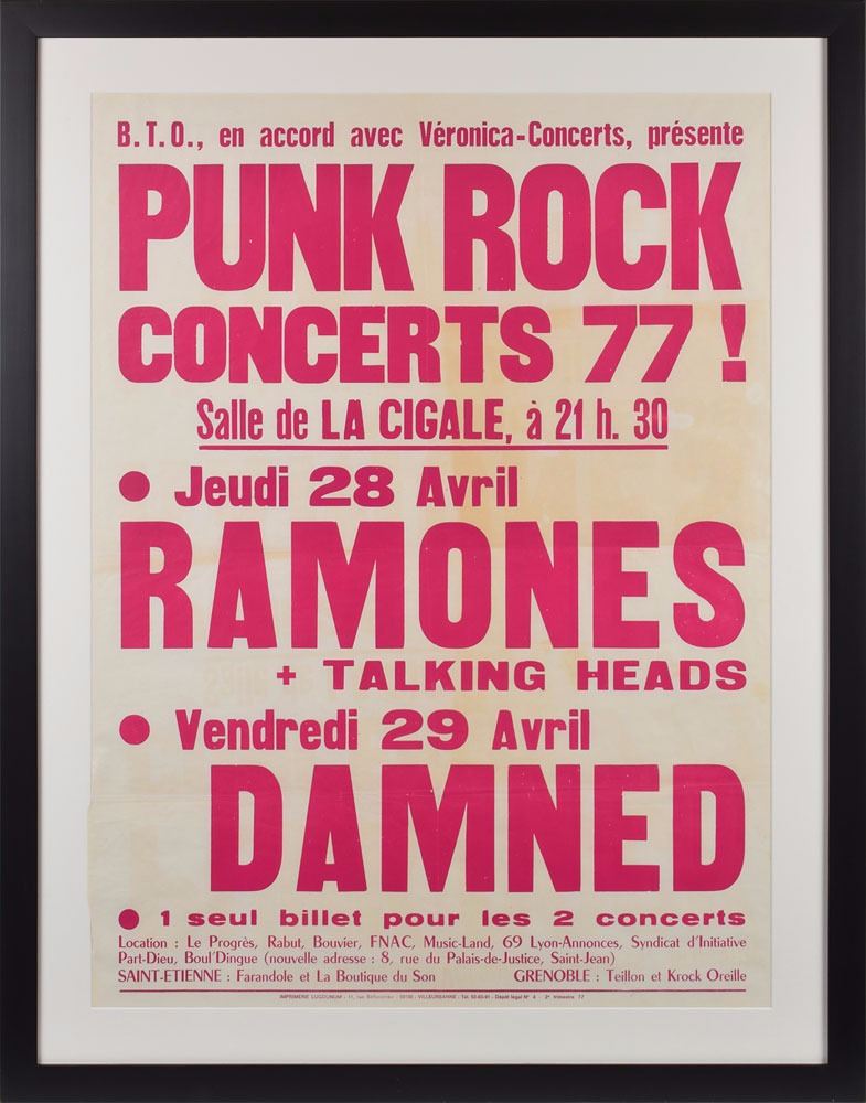 Early color "Punk Rock Concerts 77" poster promoting two shows at Salle De La Cigale in Lyon, France, 23 x 31, listing a concert for The Ramones and Talking Heads on April 28, as well as a concert for the Damned on April 29. Matted and framed to an overall size of 29.5 x 37.5. In fine condition. This was displayed as part of the “Hey! Ho! Let’s Go: Ramones and the Birth of Punk” exhibit at the Queens Museum in New York from April 10, 2016–July 31, 2016, and the Grammy Museum at L.A. Live from September 16, 2016–February 28, 2017. From the Monte A. Melnick Ramones Collection.