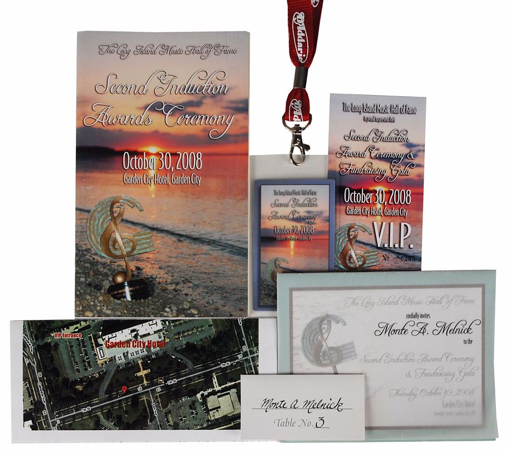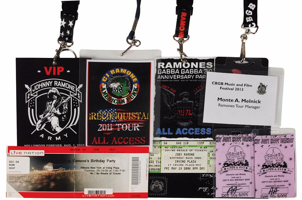 Grouping of eight passes and tickets for various commemorative Ramones concerts and events, ranging in size from 2.5 x 4.25 to 8 x 3.25, and dated between 2001 and 2013, including: two all access passes for Joey's 50th Birthday Bash at the Hammerstein Ballroom on May 19, 2001; two tickets for Joey Ramone's Birthday concerts, dated May 19, 2006 and 2009; a pass issued to Monte Melnick for the 2013 CBGB Festival, with lanyard; an all access pass for the Ramones 30th anniversary party at the Avalon Theatre on September 12, 2004, with lanyard; an all access pass for CJ Ramone's Reconquista 2011 tour, with lanyard; and a VIP pass for a Johnny Tribute at the Hollywood Forever cemetery on August 1, 2008, with lanyard. In overall fine condition. Accompanied by various material related to The Long Island Hall of Fame Second Induction Award Ceremony at the Garden City Hotel on October 30, 2008, including an invitation, driving directions, VIP ticket and talent pass, program, and seating card. From The Monte A. Melnick Ramones Collection.