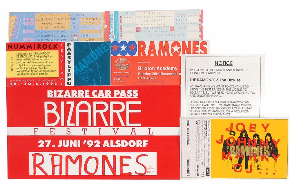 Collection of tickets and passes for various Ramones engagements, including: a ticket for B'Ginnings on June 21, 1977; a ticket for Lake Compounce on June 29, 1990; a ticket for Brixton Academy on December 20, 1992; a ticket for the Hamburg Docks on November 27, 1991; a ticket for Nummirock on June 18-20, 1992; and a car pass for the Bizarre Festival on June 27, 1992. In very good to fine condition.