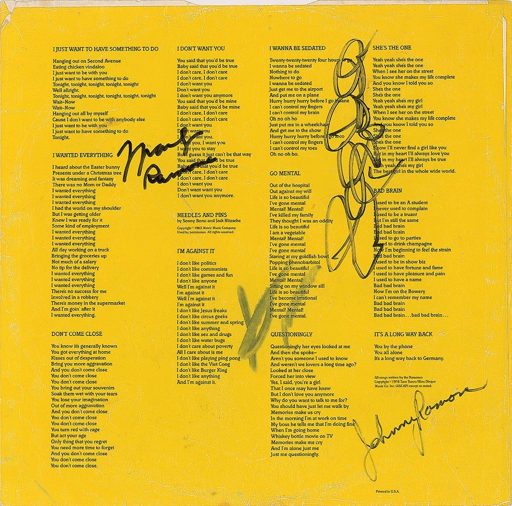 Album sleeve for Road to Ruin, the fourth studio album from the Ramones, signed on the lyric side in black felt tip by Joey, Johnny, Marky, and Dee Dee Ramone. In very good condition, with moderate overall creasing.