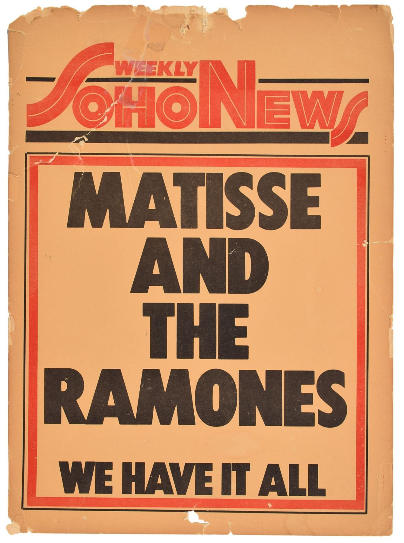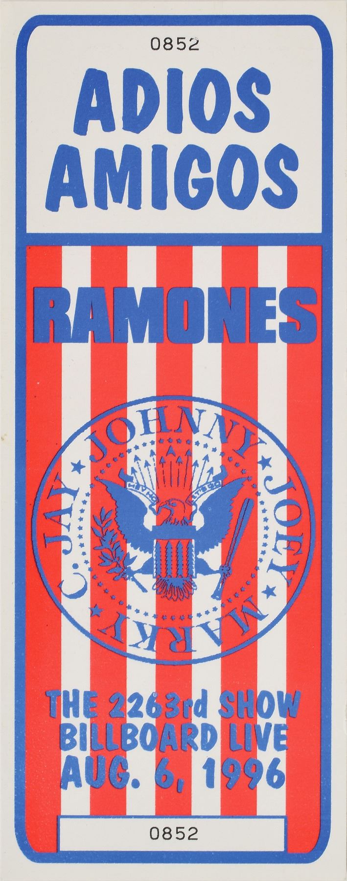 Group of four Ramones items, including: a ticket for their last-ever show on August 6, 1996, during the Adios Amigos tour; a 2002 announcement flyer for an exhibition of artwork by Dee Dee Ramone and Arturo Vega; a Soho Weekly News cover reading, "Matisse and the Ramones, We Have It All"; and a promotional album flat for Dee Dee Ramone's album Standing in the Spotlight, released under the name Dee Dee King. In overall very good to fine condition, with repaired tears and paper loss to the Soho Weekly News cover. All but the album flat are accompanied by the Grammy Museum’s inventory labels.