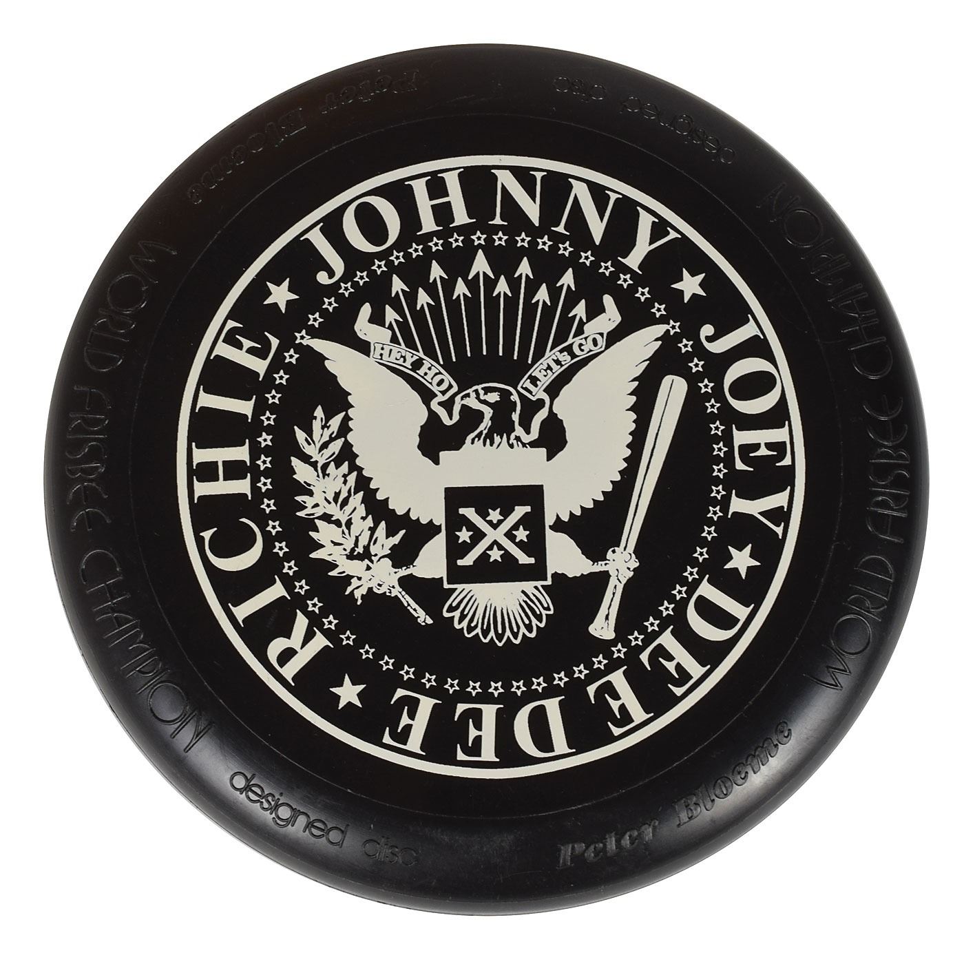 Black frisbee disc designed by world champion Peter Bloeme, measuring 9.25? in diameter, featuring a large white Ramones insignia on top. In fine condition.