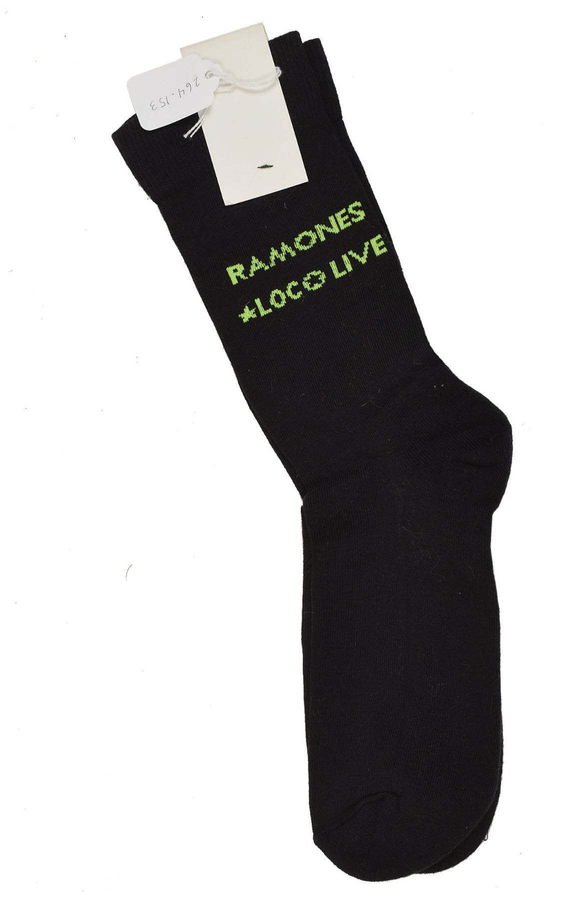 Pair of brand-new black socks, size 42–44, featuring green text, "Ramones, Loco Live," retaining their original cardboard tag at the top. In fine condition.