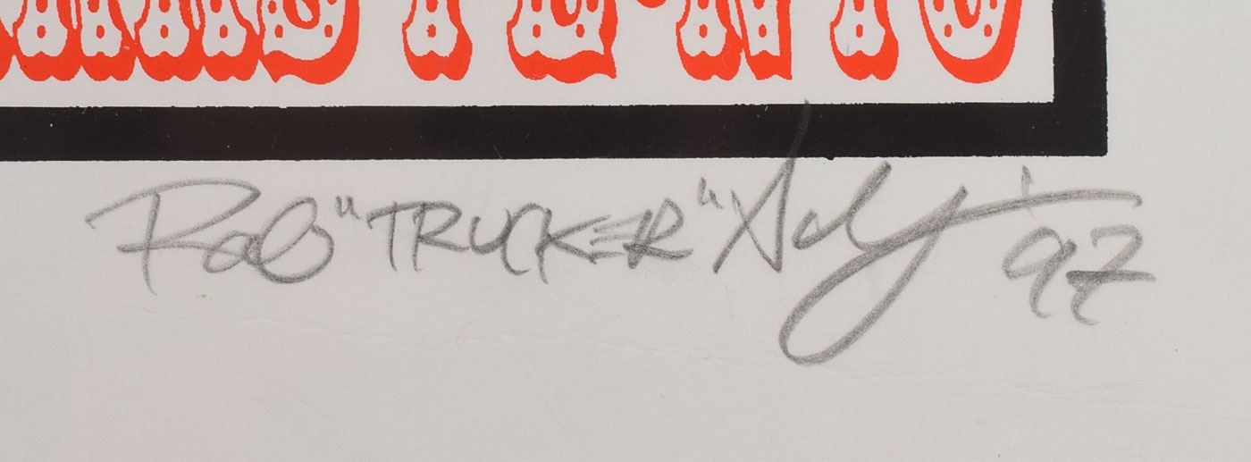 Radioactive Records color 16 x 30 poster promoting the fourteenth and final studio album by the Ramones, Adios Amigos, showing a pair of carnivorous dinosaurs wearing sombreros, signed and inscribed in silver ink by the artist, Mark Kostabi, to the band’s longtime manager, “For Monte, Kostabi, 1995.” In fine condition, with scattered creasing. This was displayed as part of the “Hey! Ho! Let’s Go: Ramones and the Birth of Punk” exhibit at the Queens Museum in New York from April 10, 2016–July 31, 2016, and the Grammy Museum at L.A. Live from September 16, 2016–February 28, 2017.